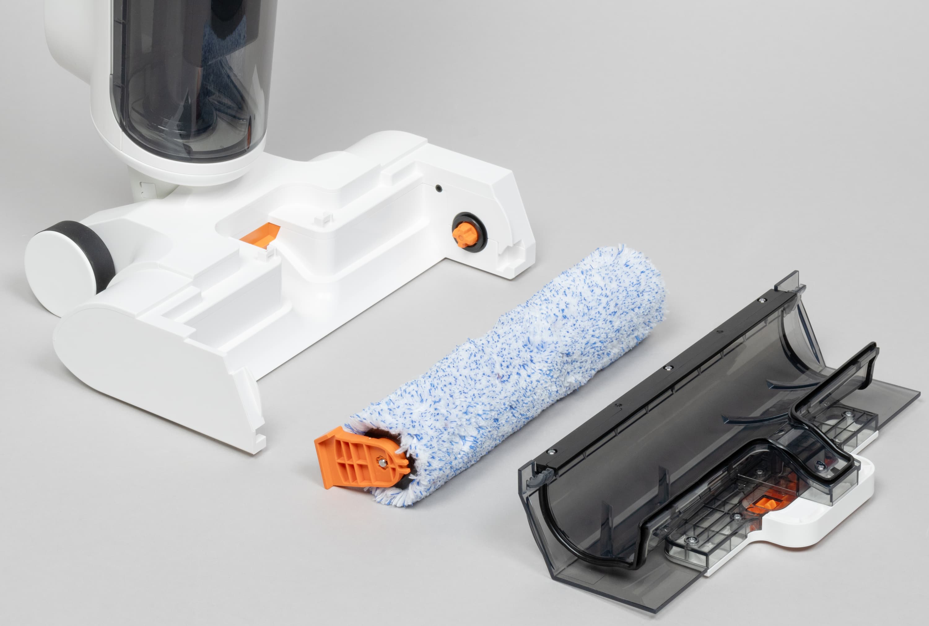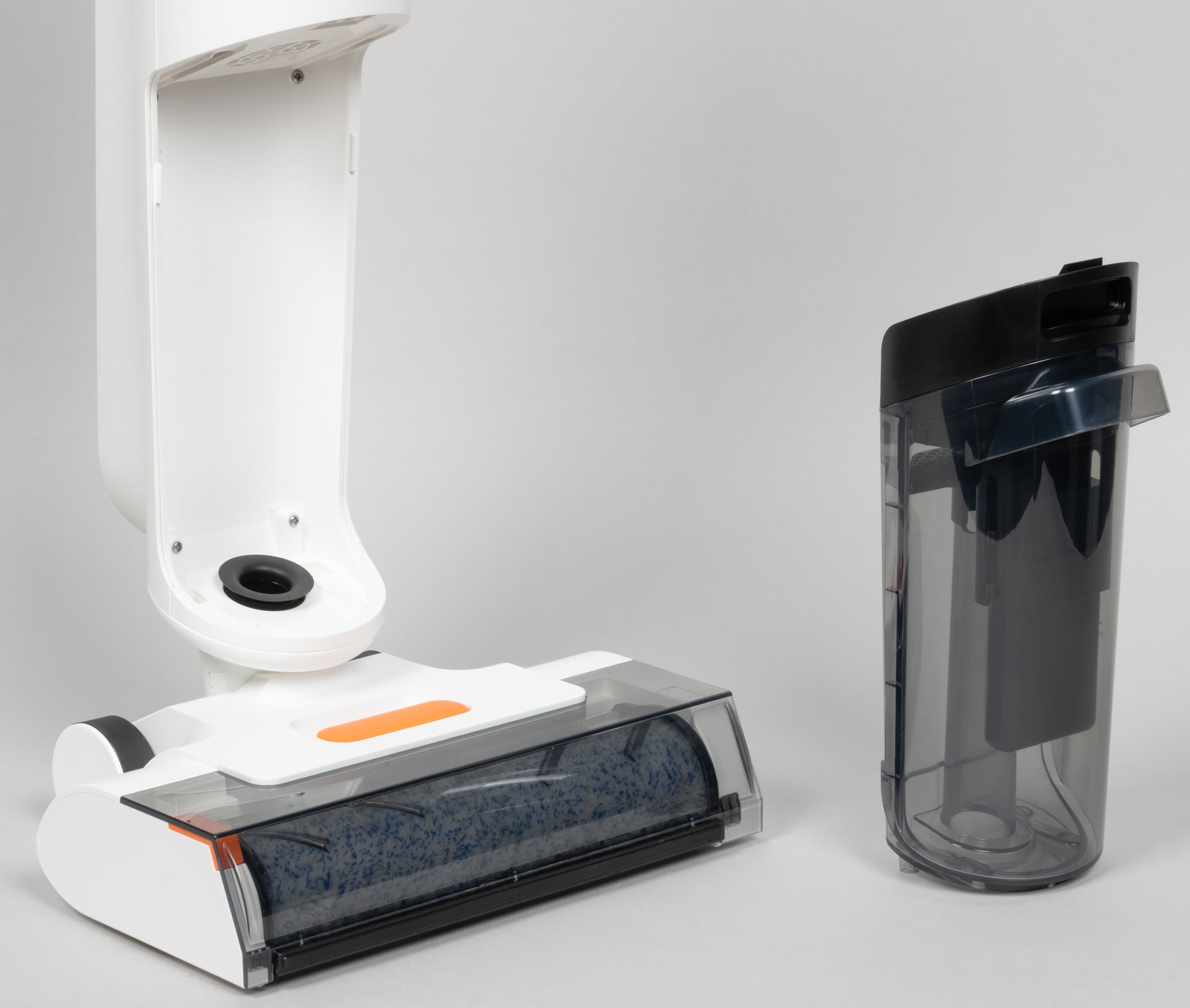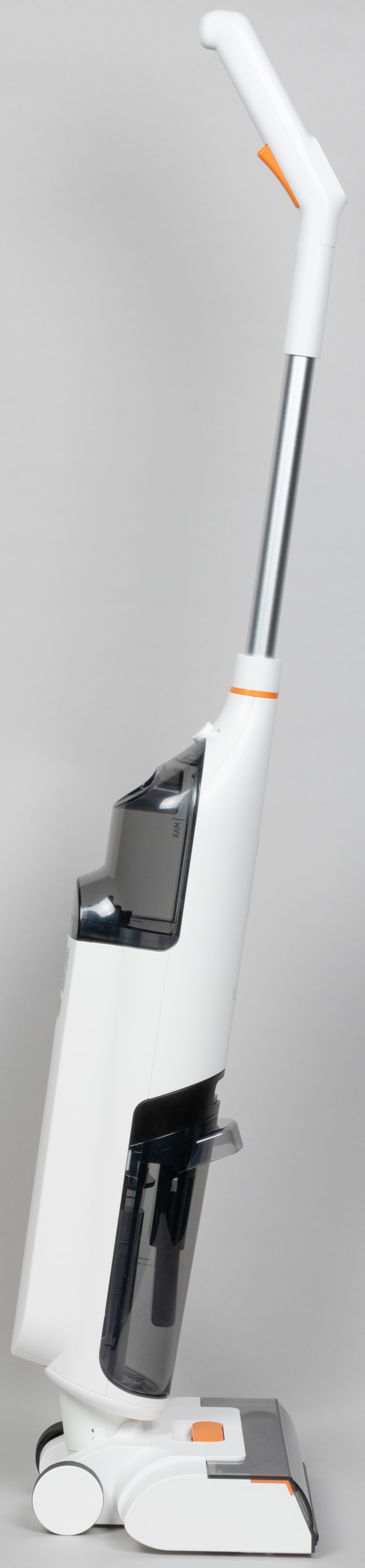 Корпус пылесоса сделан из матового белого пластика, приятного на ощупь, резервуары и крышка моторной щетки — темные, а немногочисленные декоративные элементы — ярко-оранжевые.