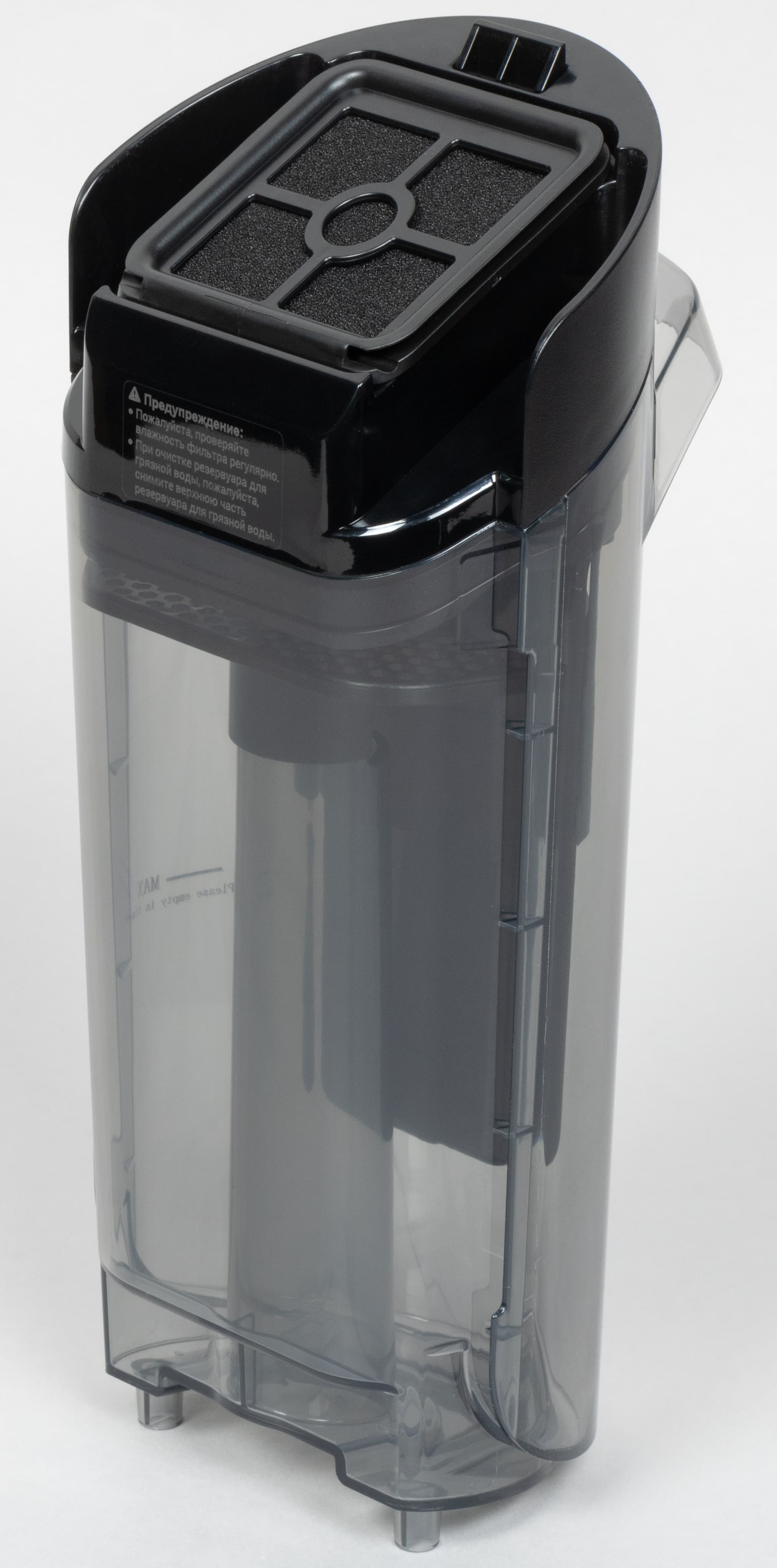 Модуль состоит из бака для воды, сделанного из темного прозрачного пластика, и крышки с моющимся воздушным фильтром. В качестве датчика уровня жидкости, своевременно извещающего пользователя о переполнении резервуара, тут служит поплавковый механизм — вместо традиционных электроконтактов.
