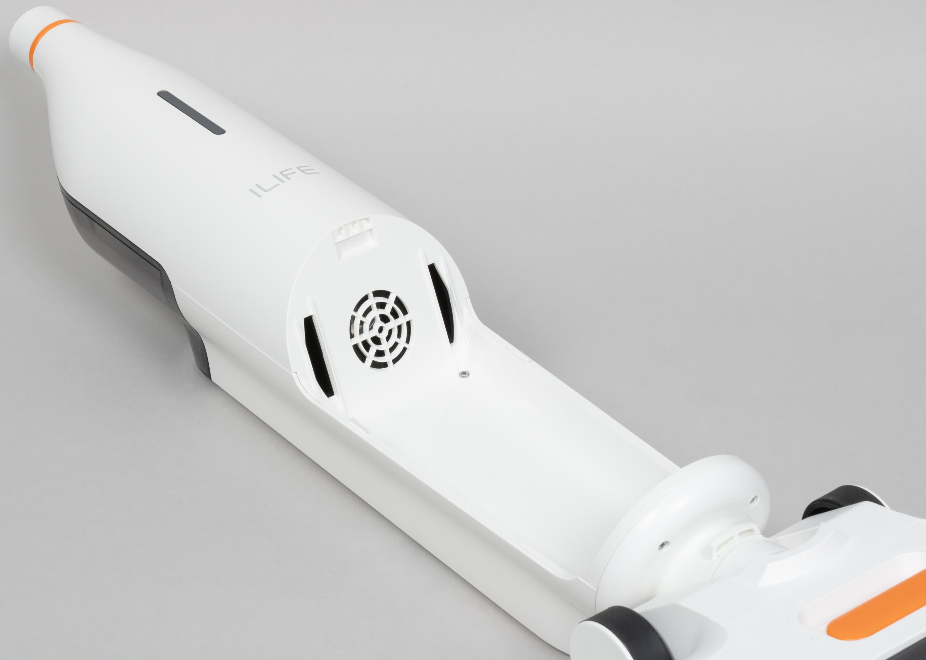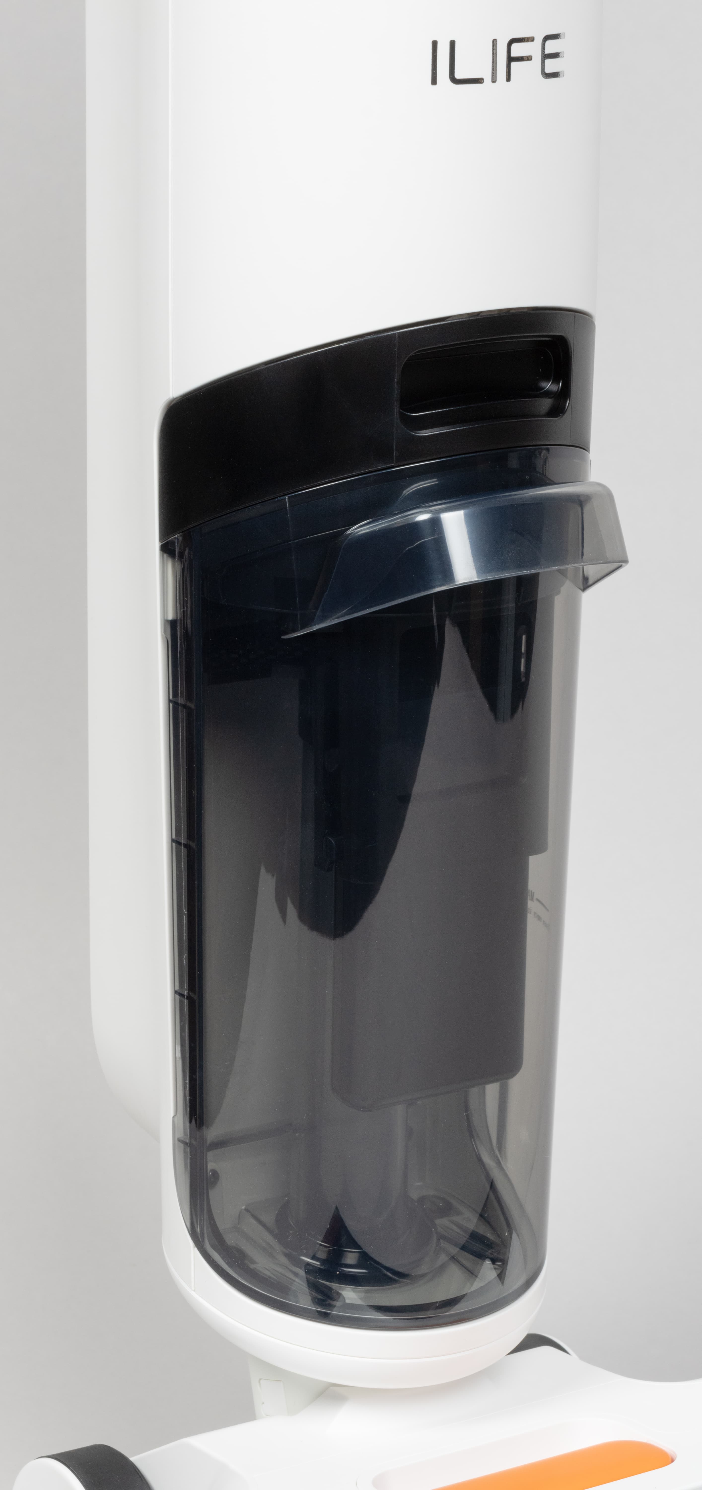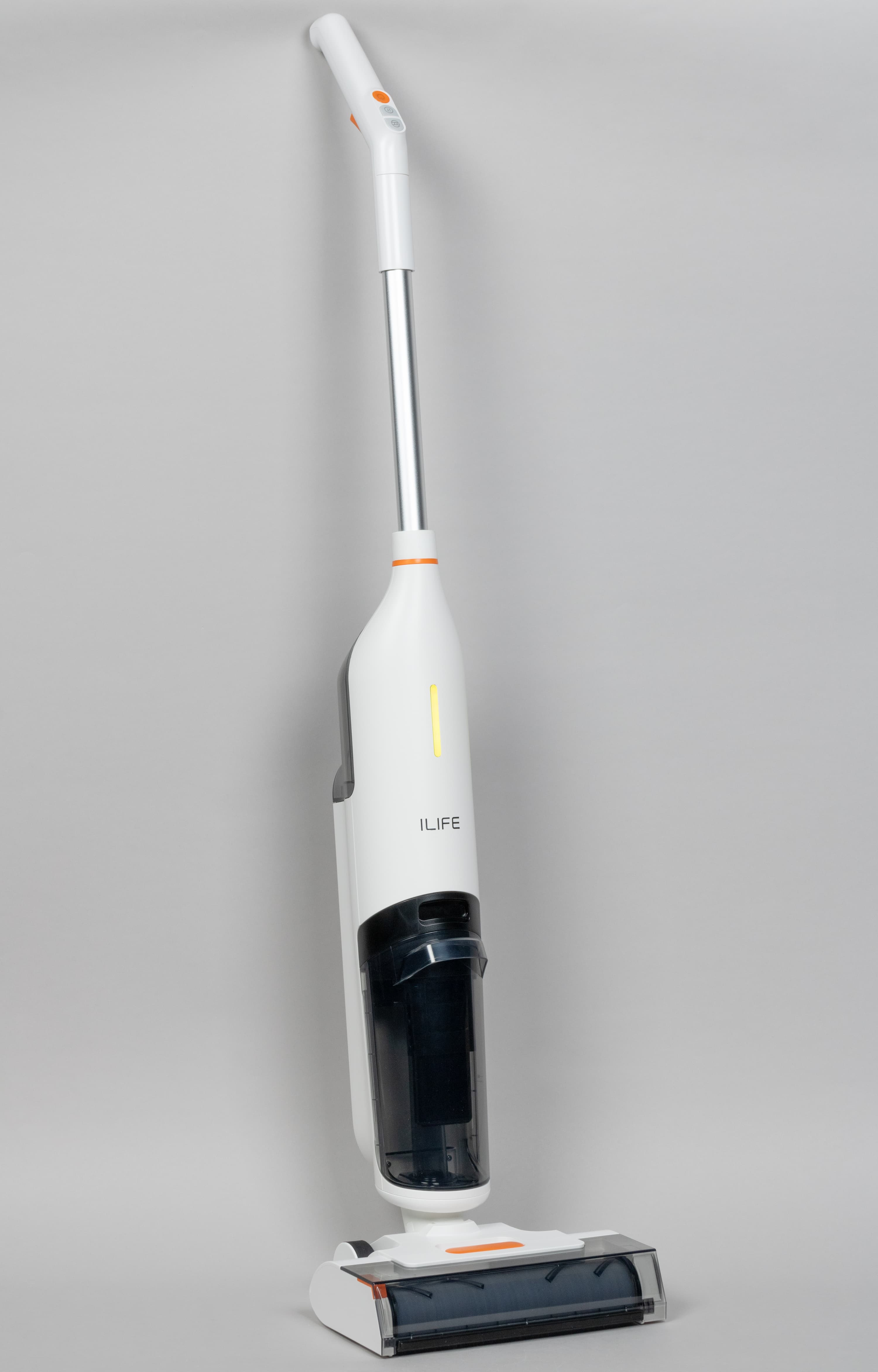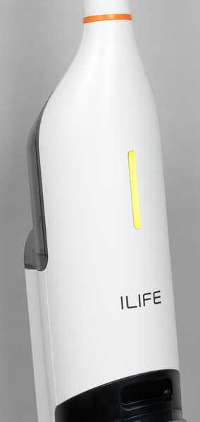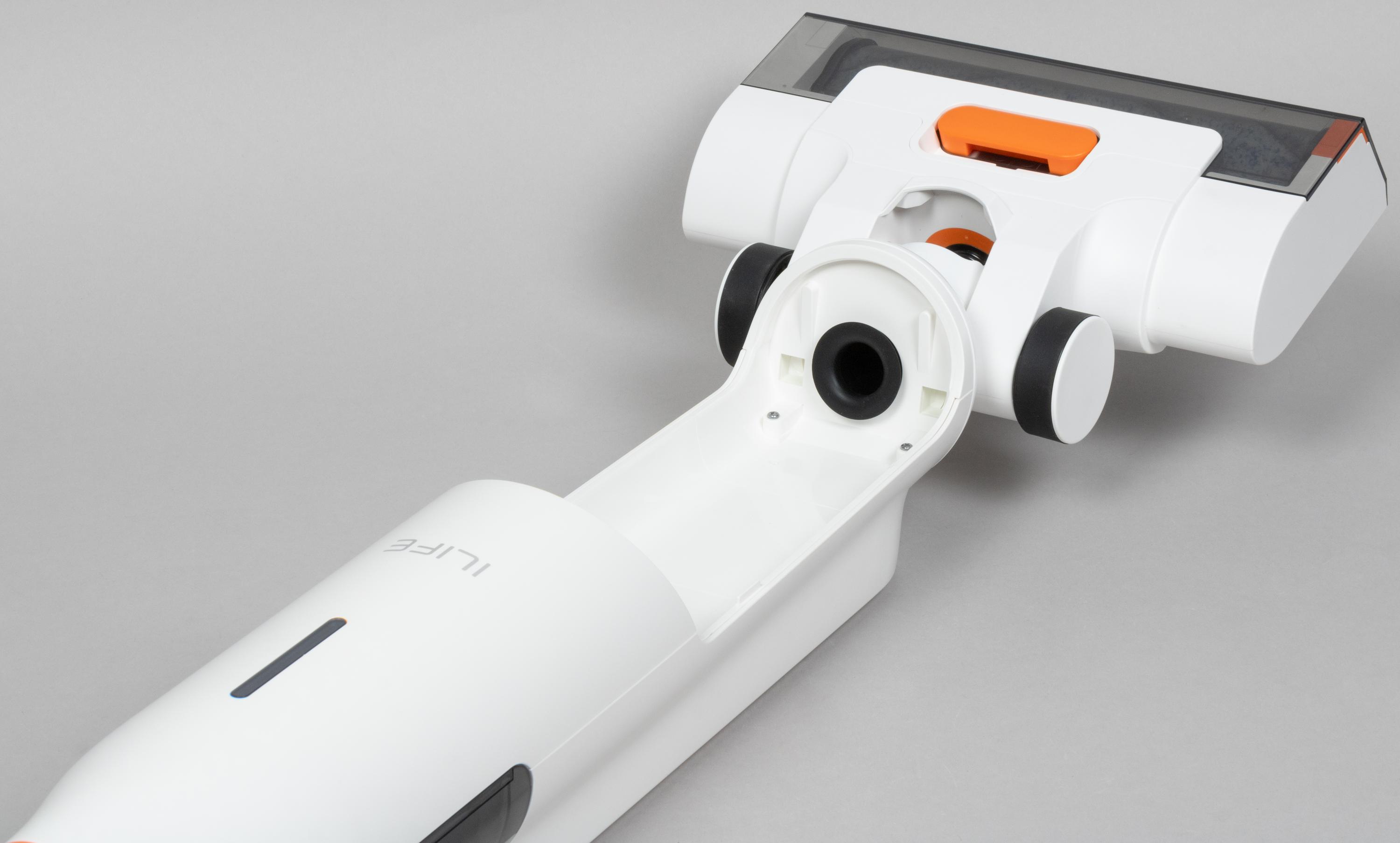Компоновка iLife W90 традиционна для моющих аккумуляторных пылесосов. В верхней части сигарообразного корпуса размещается резервуар для чистой воды.
