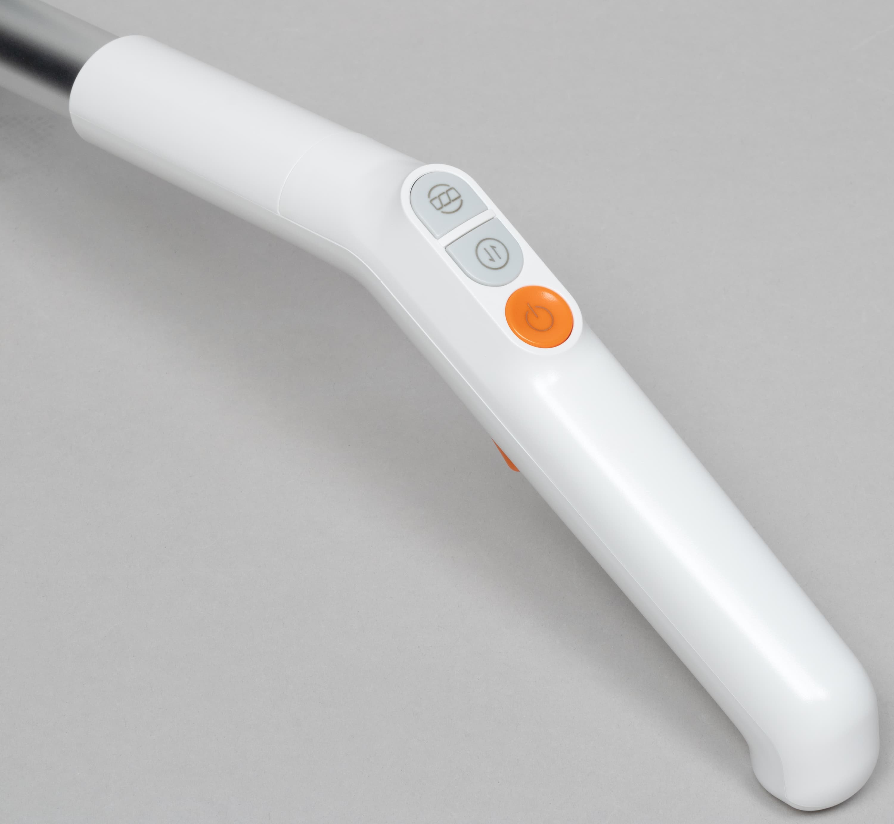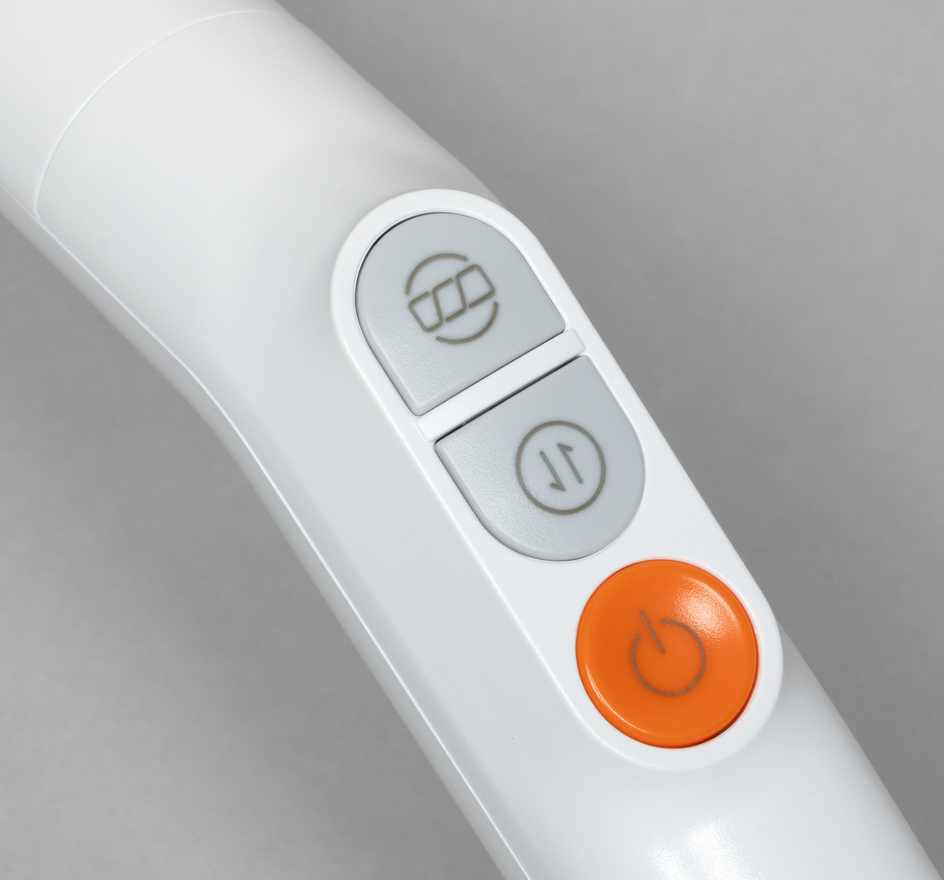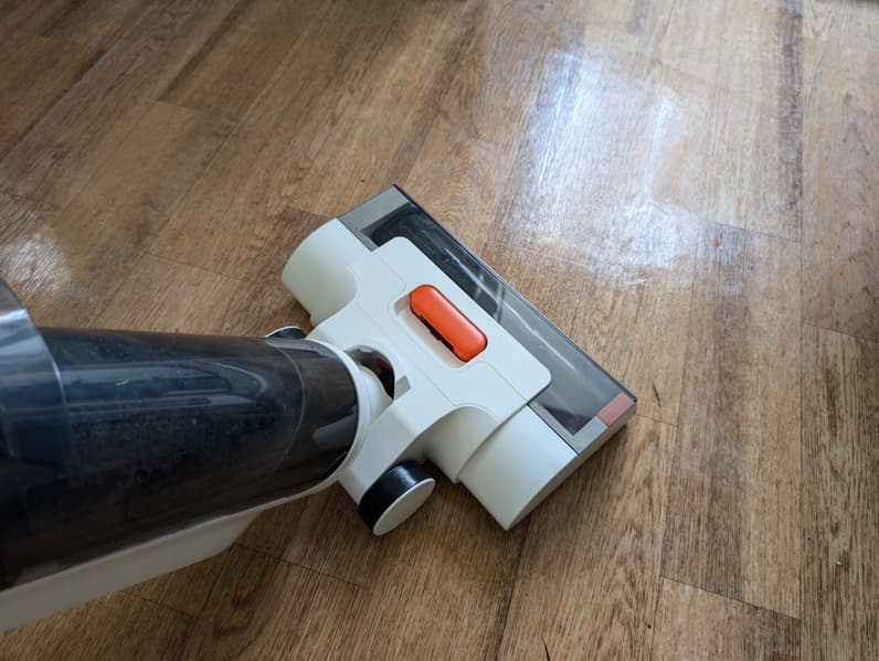 Оранжевая клавиша на обратной стороне ручки управляет подачей воды на электрощетку. Расход жидкости в этой модели зависит от пользователя: напольное покрытие увлажняется только тогда, когда это требуется.