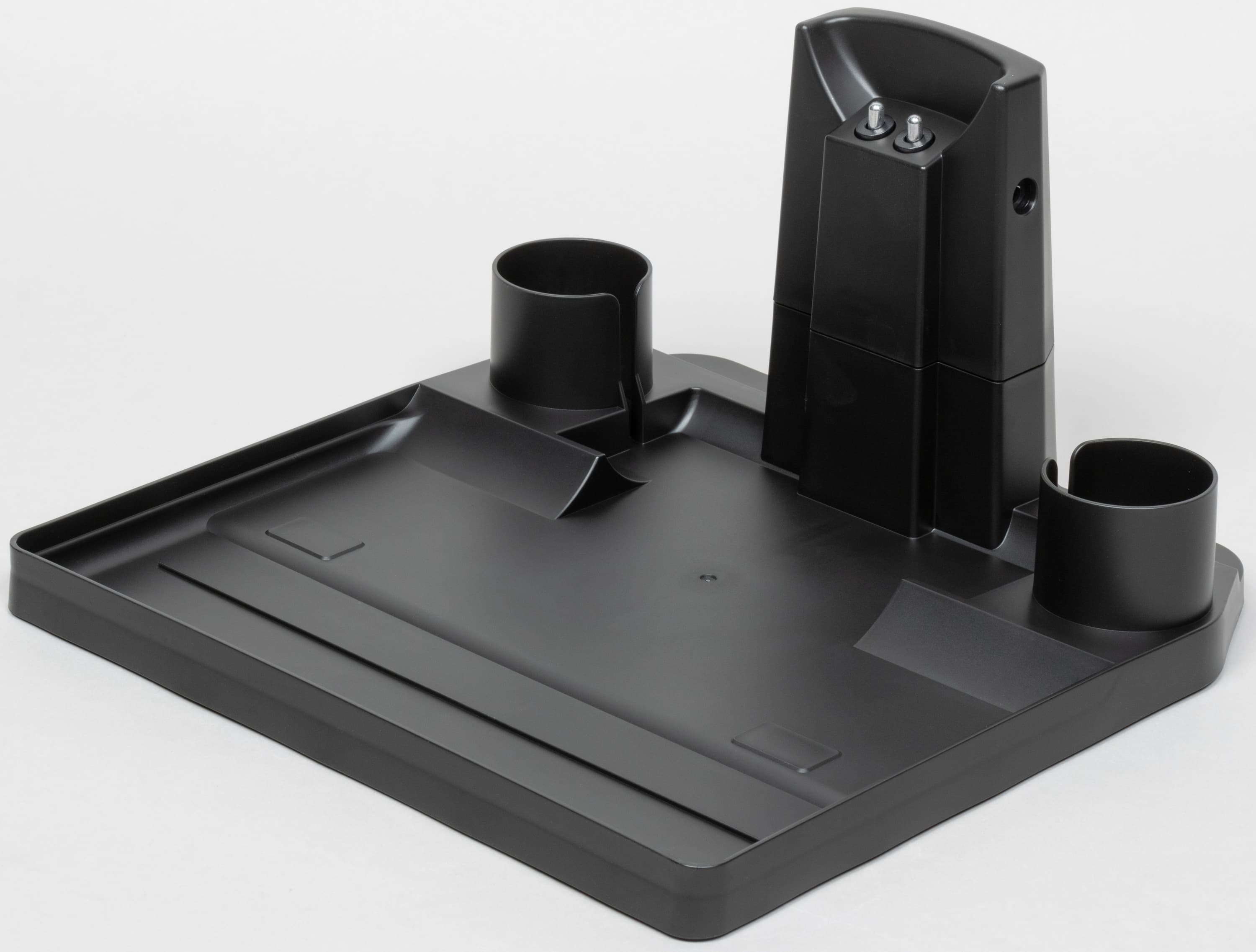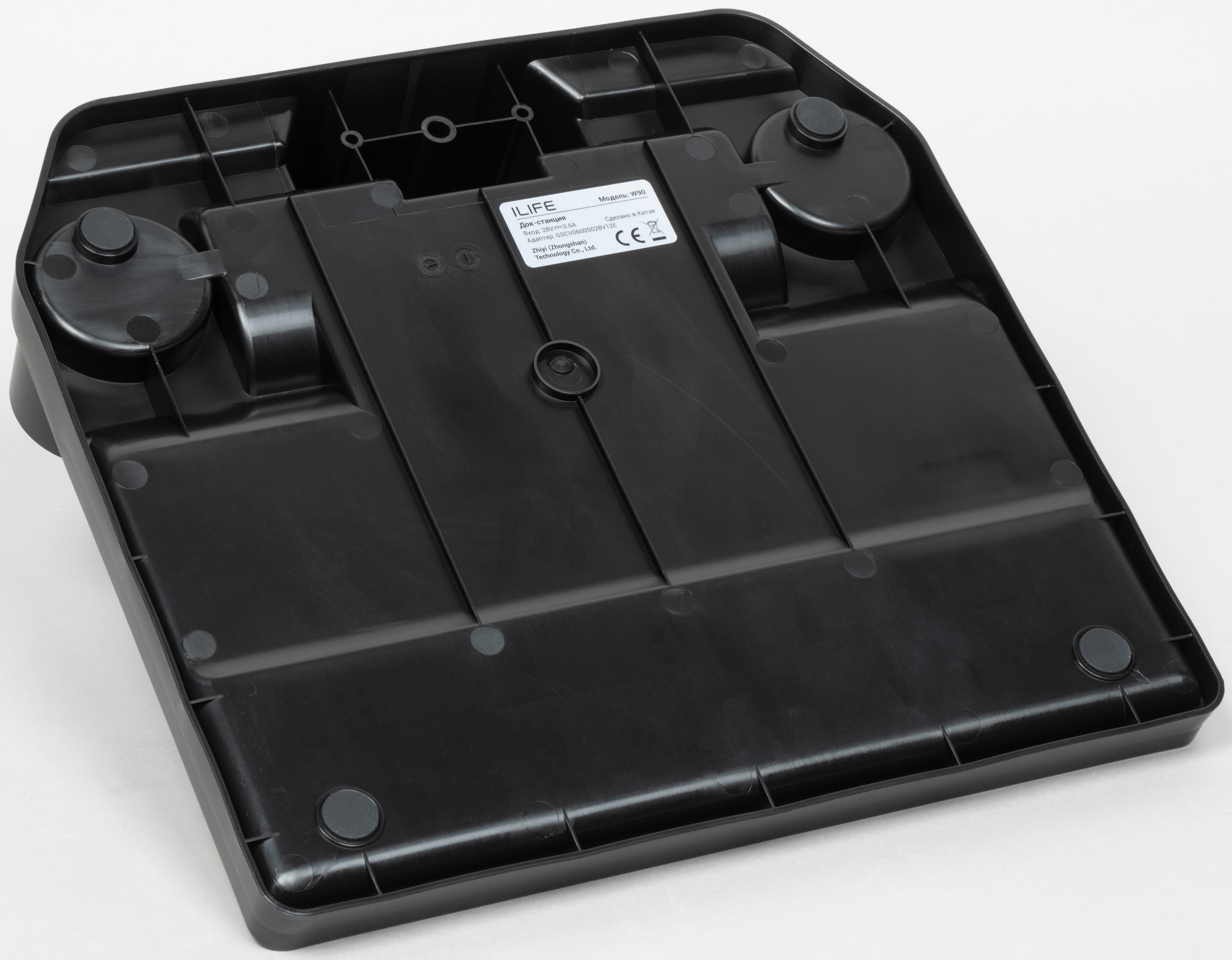 Базовая станция предназначена для самоочистки устройства, его зарядки и хранения. В ее плоской части есть небольшое углубление для сбора грязной воды при промывке ротора, а на вертикальном основании — два электрических контакта, обеспечивающие подключение пылесоса к источнику переменного тока.