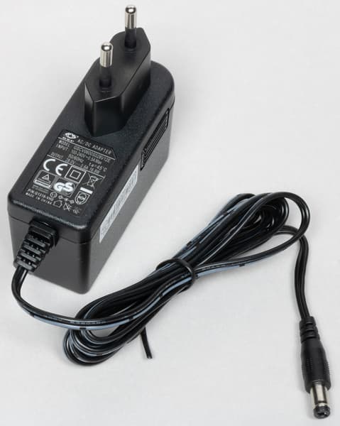 К разъему на задней части зарядной станции присоединяется адаптер питания. Согласно маркировке на корпусе, он обеспечивает устройство постоянным током 28 В, 0,6 А.