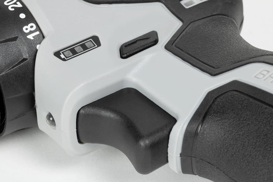 Рычаг пуска нажимается со средним усилием и имеет ход 9 мм. Первый миллиметр хода — холостой, на втором миллиметре выключается подсветка и индикаторы заряда, а двигатель запускается при нажатии рычага на глубину 3 мм. Таким образом, для регулировки скорости остаются 6 мм хода рычага. Направление вращения шпинделя выбирается перекидным переключателем, среднее положение которого блокирует рычаг пуска. Хранить или транспортировать инструмент рекомендуется именно в таком среднем положении переключателя. Это чтобы какой-либо предмет не нажал случайно рычаг. Ведь инструмент не имеет своего безопасного кофра-чемоданчика.