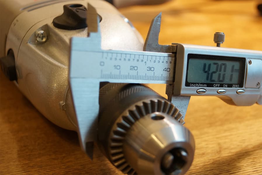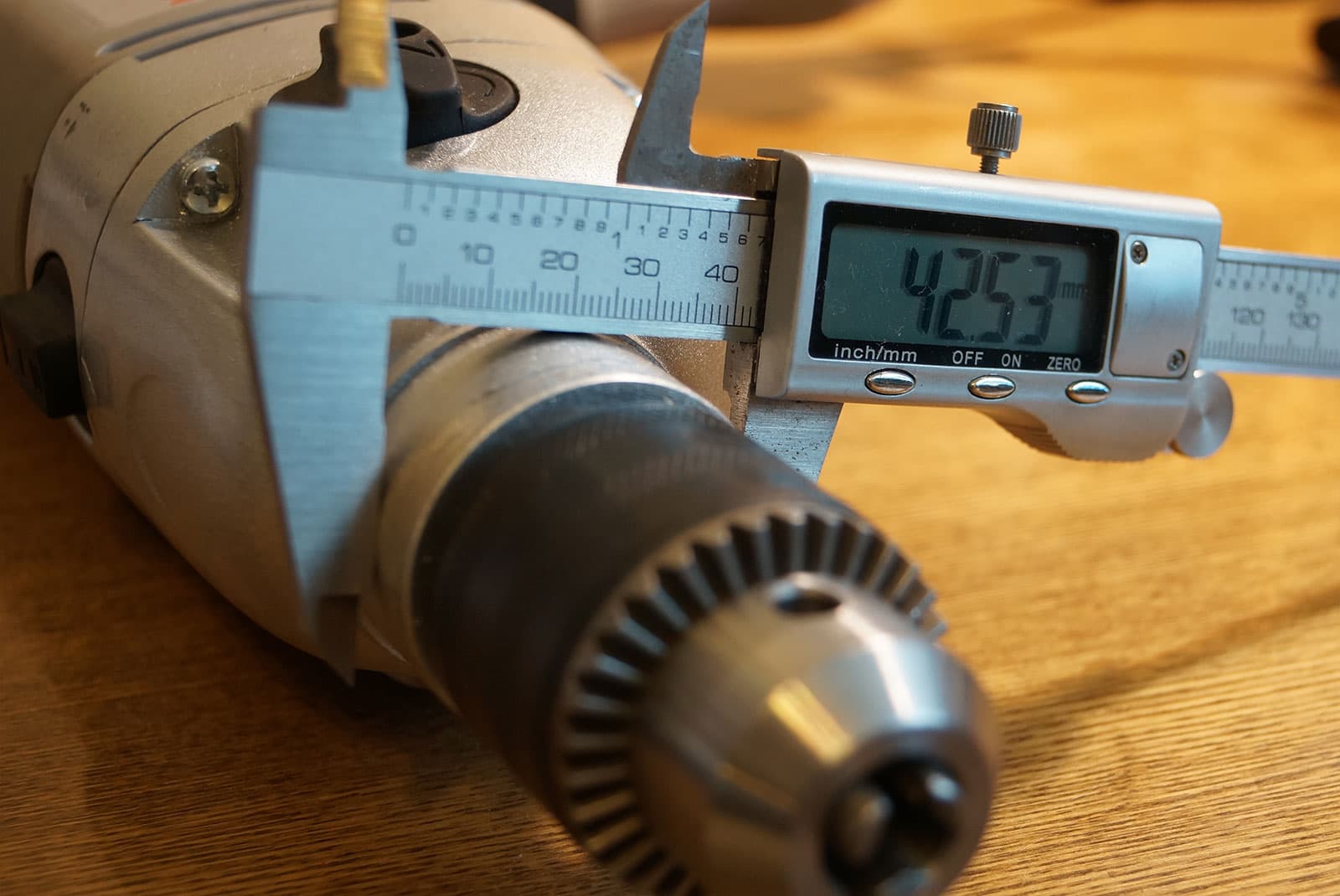 Постоянный читатель уже в курсе, почему эти размеры представляют для нас интерес. Патрон или шейка дрели, имеющие диаметр чуть больше 43 мм, не смогут протиснуться в муфту стойки для дрелей. А такое использование проводного инструмента вполне логично, ведь дрель «благодаря» проводному питанию фактически стационарна.