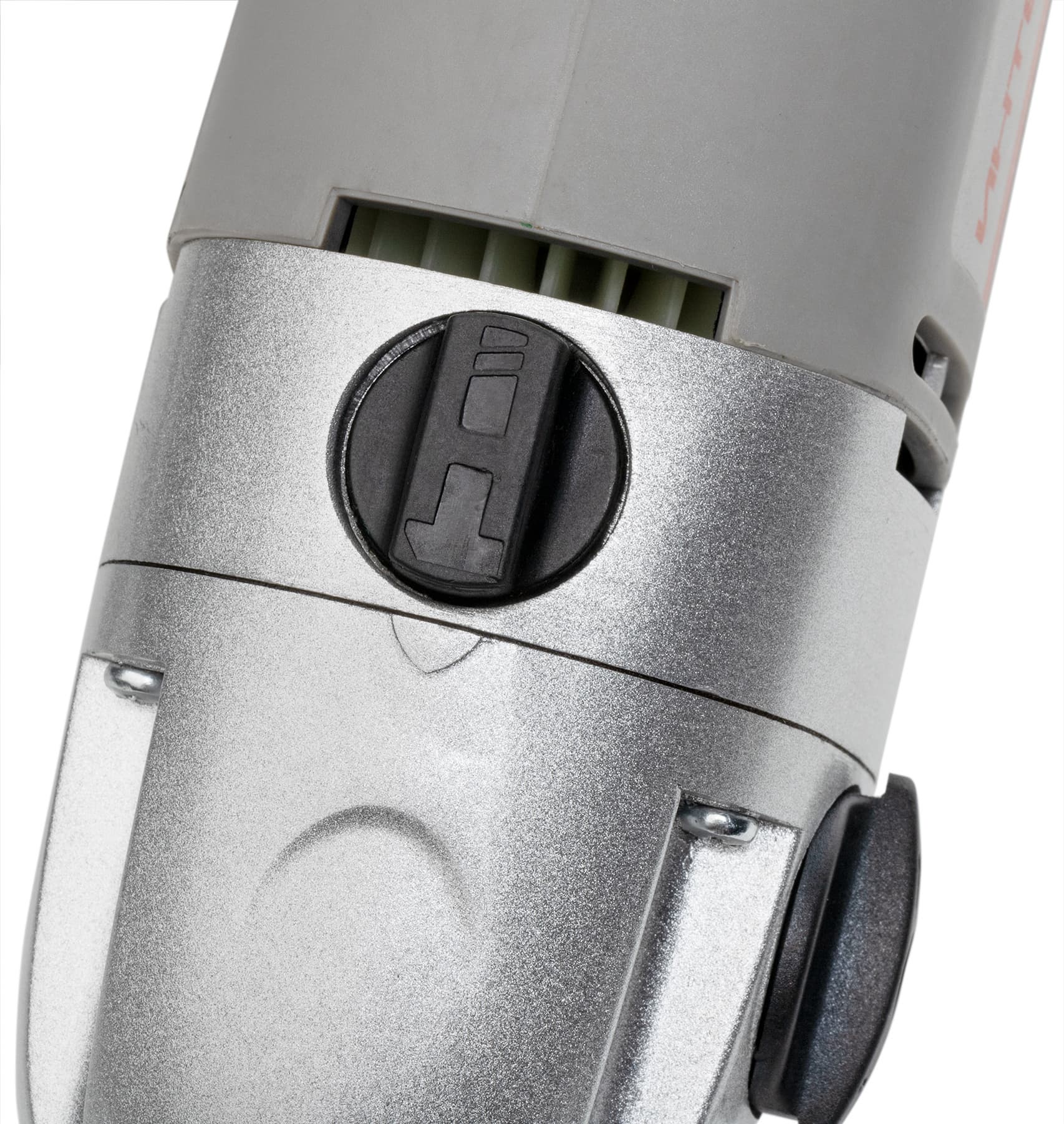 Направление вращения шпинделя изменяется опять же оригинально, не как у всех. Вместо перекидного ползунка, который «пронизывает» корпус инструмента насквозь, здесь установлен флажок-переключатель.
