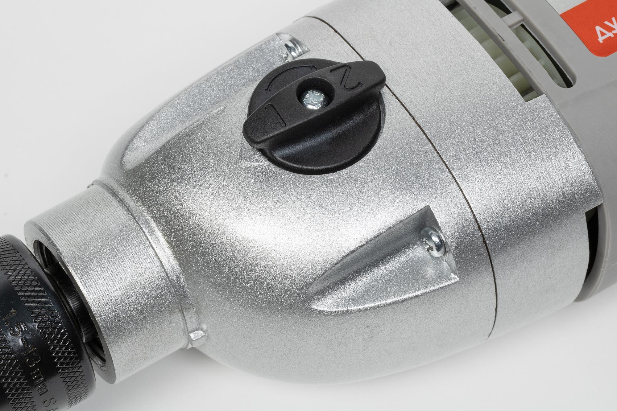 Режим работы (сверление, сверление с ударом) выбирается не переключателем-ползунком, который имеется в большинстве ударных дрелей. Тут используется суровый поворотный переключатель, который можно вращать в любом направлении.