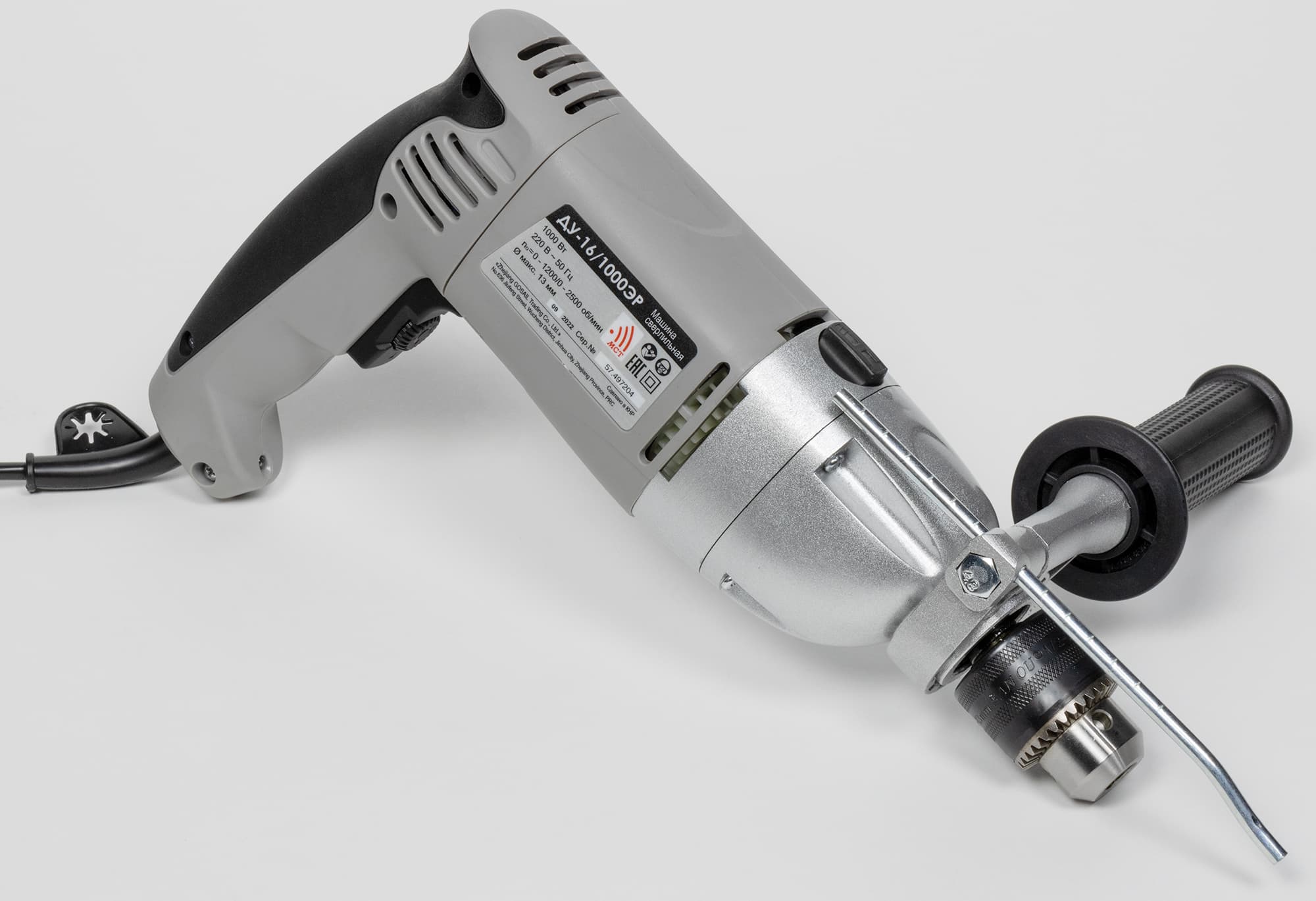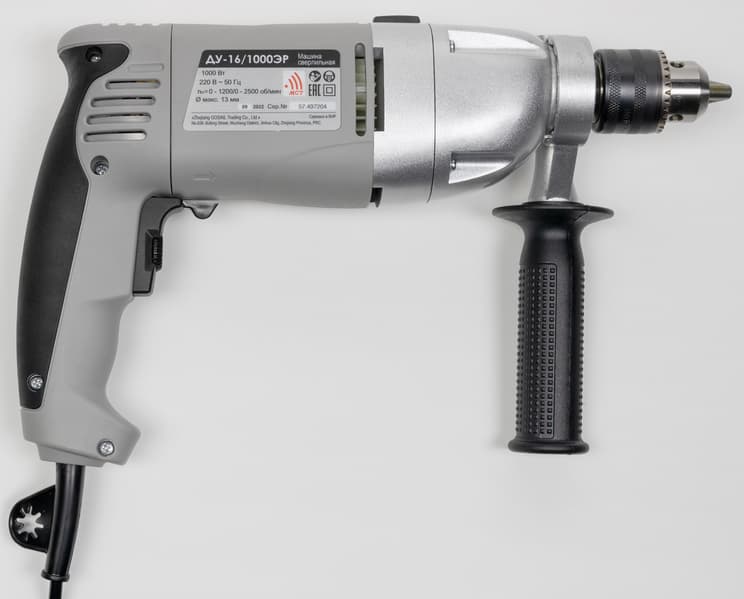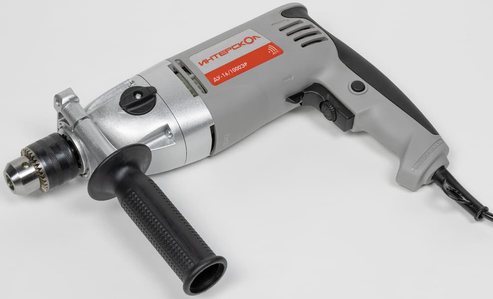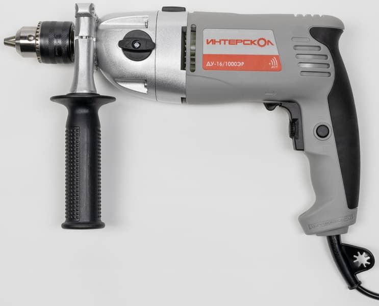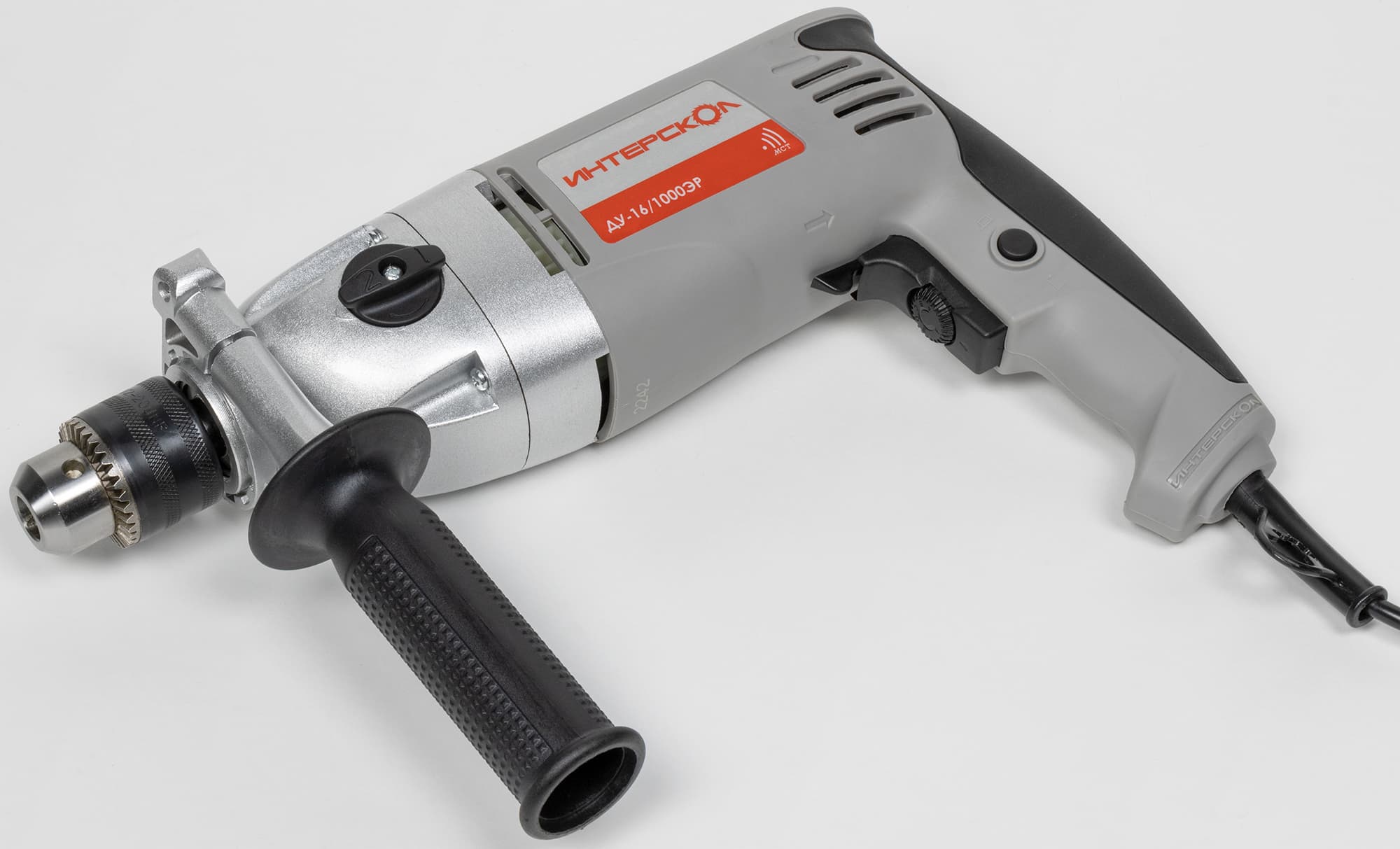 Сверлильная машина (таково ее официальное определение) Интерскол ДУ-16/1000ЭР оснащена двухскоростным редуктором с металлическим корпусом, обеспечивающим надежность при высоких нагрузках. Ударный режим работы ускорит сверление таких материалов, как кирпич или бетон, а высокая мощность двигателя дает возможность использования инструмента для замешивания строительных смесей.
