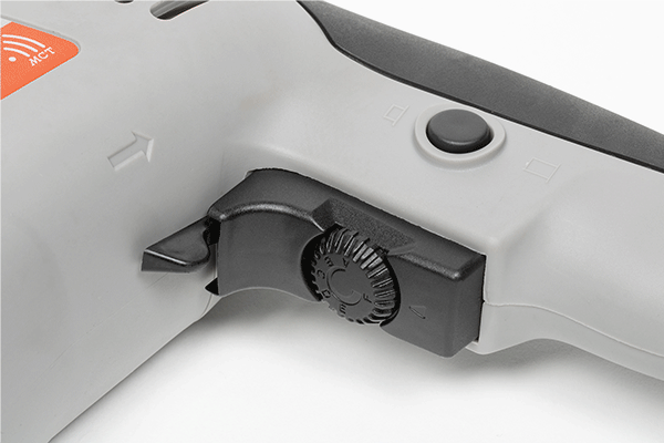 Рычаг пуска двигателя нажимается со средним усилием и утапливается на глубину в 7,3 мм. Первые полтора миллиметра хода рычага — холостые, так что на изменение скорости вращения шпинделя остается почти шесть миллиметров.