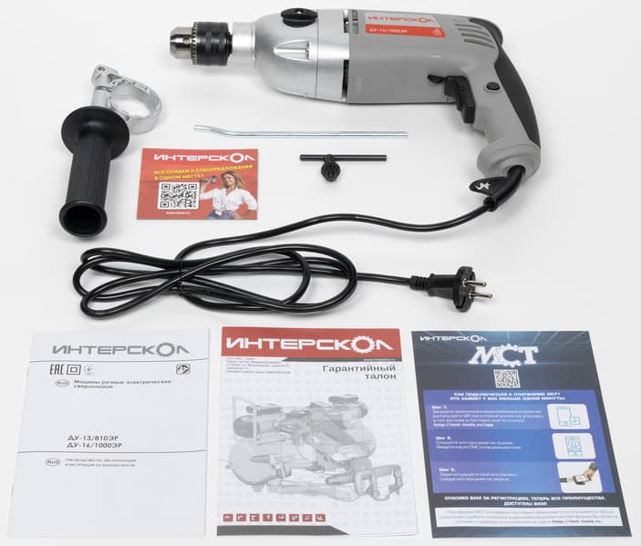 Комплектность вполне типичная: дополнительная рукоять, металлический ограничитель глубины сверления, патронный ключ, книжка-руководство и листовки.