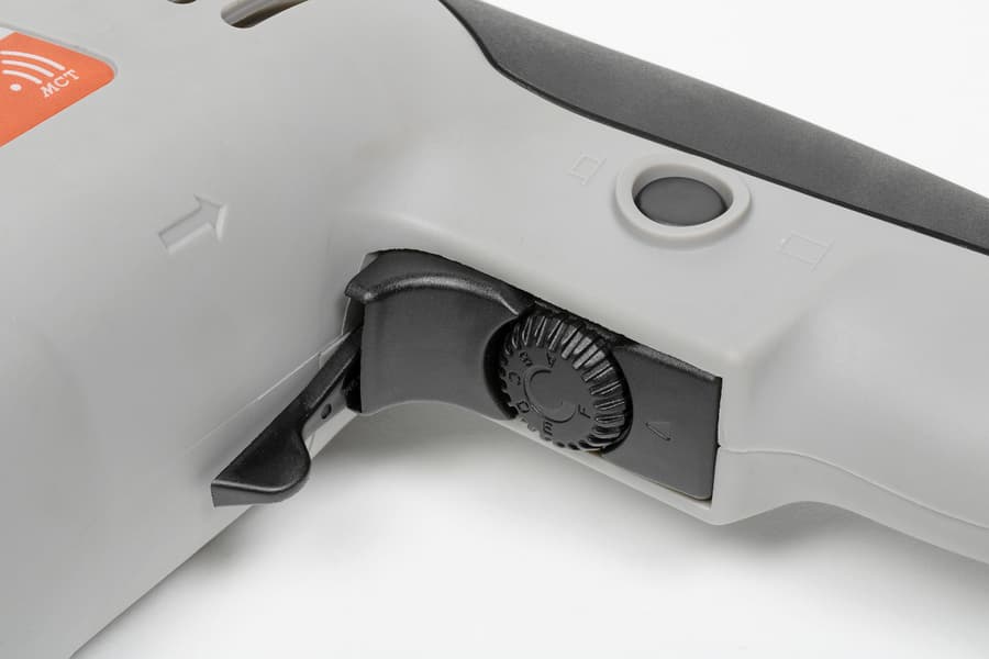 Минус такого решения заключается в том, что сдвинуть этот флажок очень легко, а поскольку расположен он буквально над рычагом пуска, то перекинуть флажок случайно — пара пустяков. Даже не заметишь, если работаешь в перчатках. А потому нужно брать за правило: перед работой удостовериться в правильном направлении вращения патрона. Одно сверло, кстати, мы загубили именно потому, что флажок был случайно перекинут.