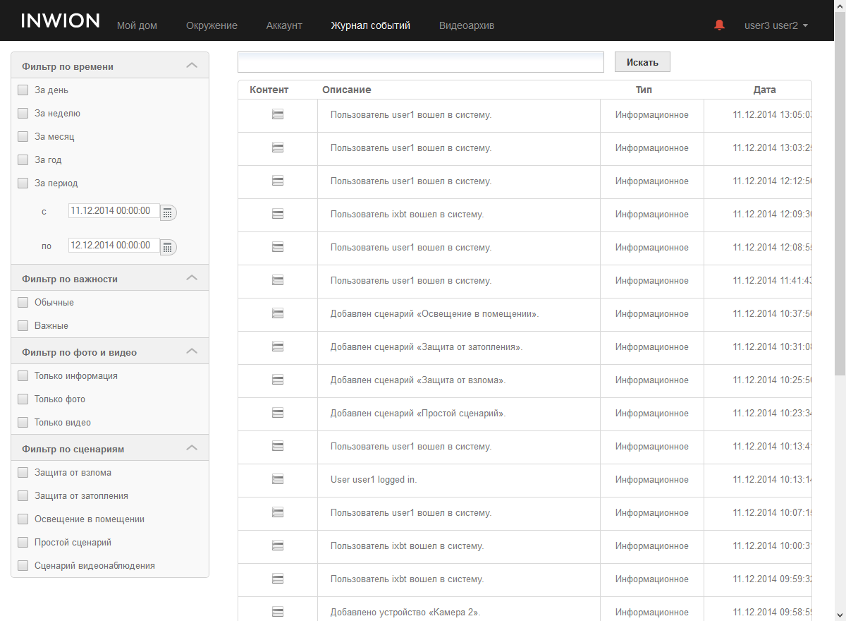На странице «Журнал событий» собраны относящиеся к самой системе записи — доступность контроллера, добавление и удаление устройств, вход пользователя на портал. Предусмотрены несколько фильтров для удобства анализа и поиска информации в журнале. Кроме того, здесь же можно оперативно посмотреть сопутствующие событию фото или видеофайлы.