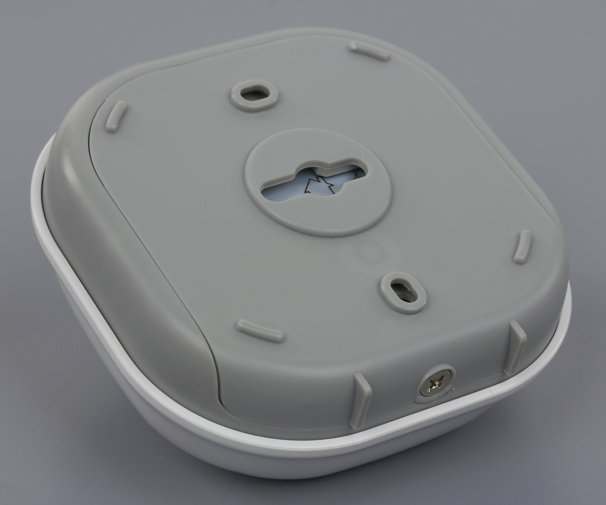 Корпус основного блока изготовлен из белого матового пластика и имеет крышку, под которой находится батарейный отсек. Для крепления устройства используются два отверстия на данной крышке. Из-за относительно большого веса, лучше использовать именно винты или шурупы, а не двухсторонний скотч. Да и магнит тоже стоит закрепить более надежно, особенно если речь идет о часто используемой двери. В центре основного блока установлен красный индикаторный светодиод.