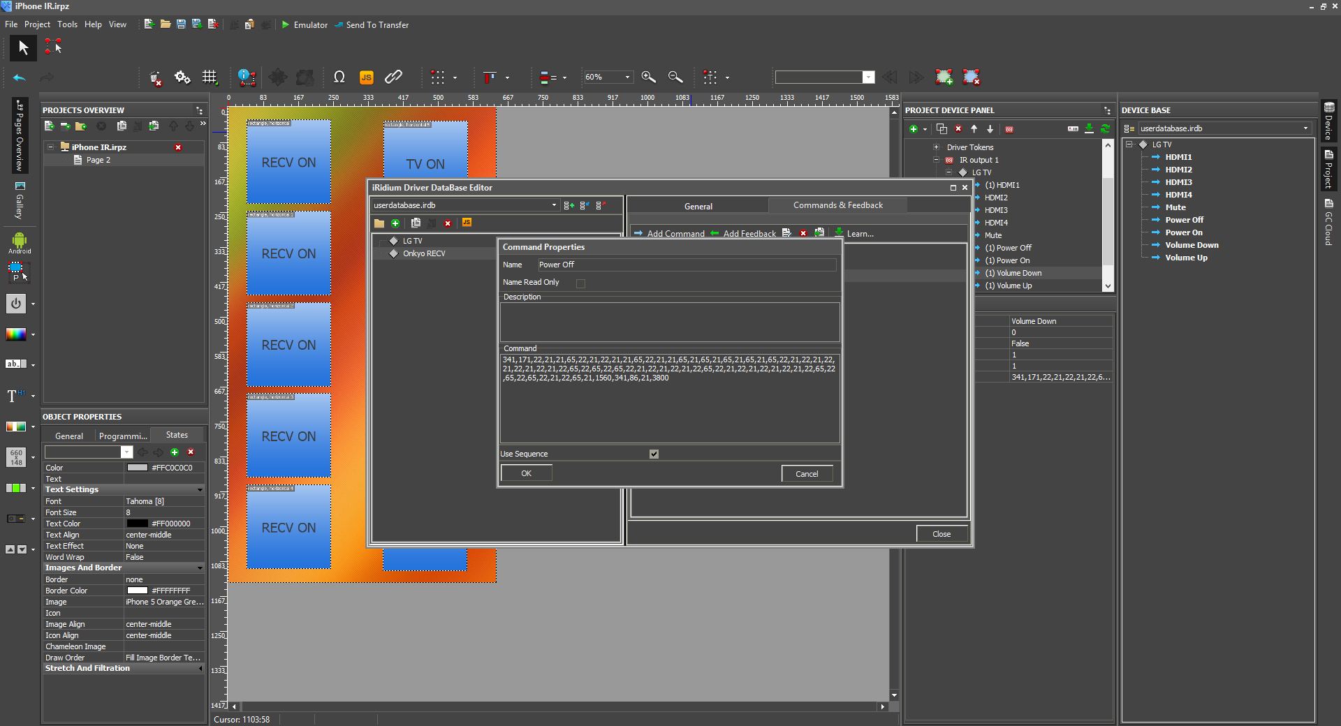 После нахождения требуемых кодов, попробуем использовать их в проекте автоматизации. В первом примере мы взяли продукт iRidium. Несмотря на то, что он имеет встроенную базу кодов Global Cache, по описанным выше причинам рекомендуется использовать именно новые найденные и проверенные коды.