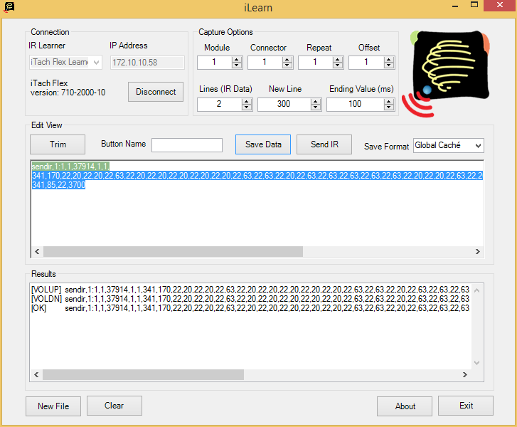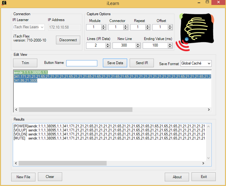 После оцифровки нескольких кнопок пульта в iTach Flex можно получить требуемое «окружение» для наших кодов — приставку «sendir,1:1,1,38186,1,1,342,170,» и суффикс «22,1547,342,85,22,3800». Результат после добавления непосредственных команд можно посмотреть в отдельном текстовом файле.