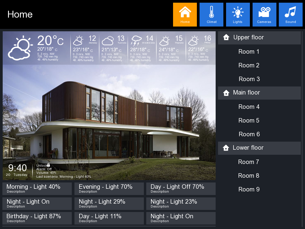 В то же время, надо отметить, что текущая версия решения является именно панелью управления, а не автономным сервером. Вы можете использовать в проекте сразу несколько панелей разного формата, с разными интерфейсами и разными решаемыми задачами (например, они могут существенно отличаться для детской и для кабинета), но все они будут выполнять функцию управления запрограммированным набором устройств по командам пользователя (включая получение обратной связи, если это предусмотрено), но не фоновые «серверные» задачи контроллера системы автоматизации. В настоящий момент, средств для прямого взаимодействия панелей не предусмотрено. Однако, если речь идет о синхронизации данных с внешних устройств, то это обычно возможно.