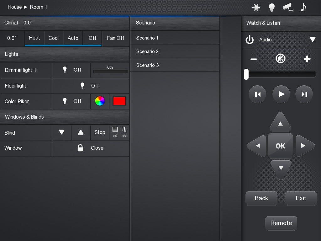 Первый вариант скорее интересен с точки зрения настройки и обслуживания системы, поскольку представить себе, что через него будут проводиться обычные операции, например включение световой сцены или анализ состояния датчиков, достаточно сложно. Хотя надо отметить, что версия от Fibaro оказалась очень красивой и функциональной. Работа с мобильными устройствами действительно сегодня находится в тренде — смартфоны есть практически у каждого пользователя и установка еще одной программы для контроля за «умным домом» выглядит вполне логично. Хотя конечно говорить об универсальности этого варианта мы бы не стали. Все-таки включить свет удобнее с кнопки на стене, а для управления медиаплеером традиционный ИК-пульт с «аппаратными кнопками», на наш взгляд, вне конкуренции. А вот для выбора интернет-радио, музыкального альбома или цвета светильника RGB смартфоны отлично подходят.