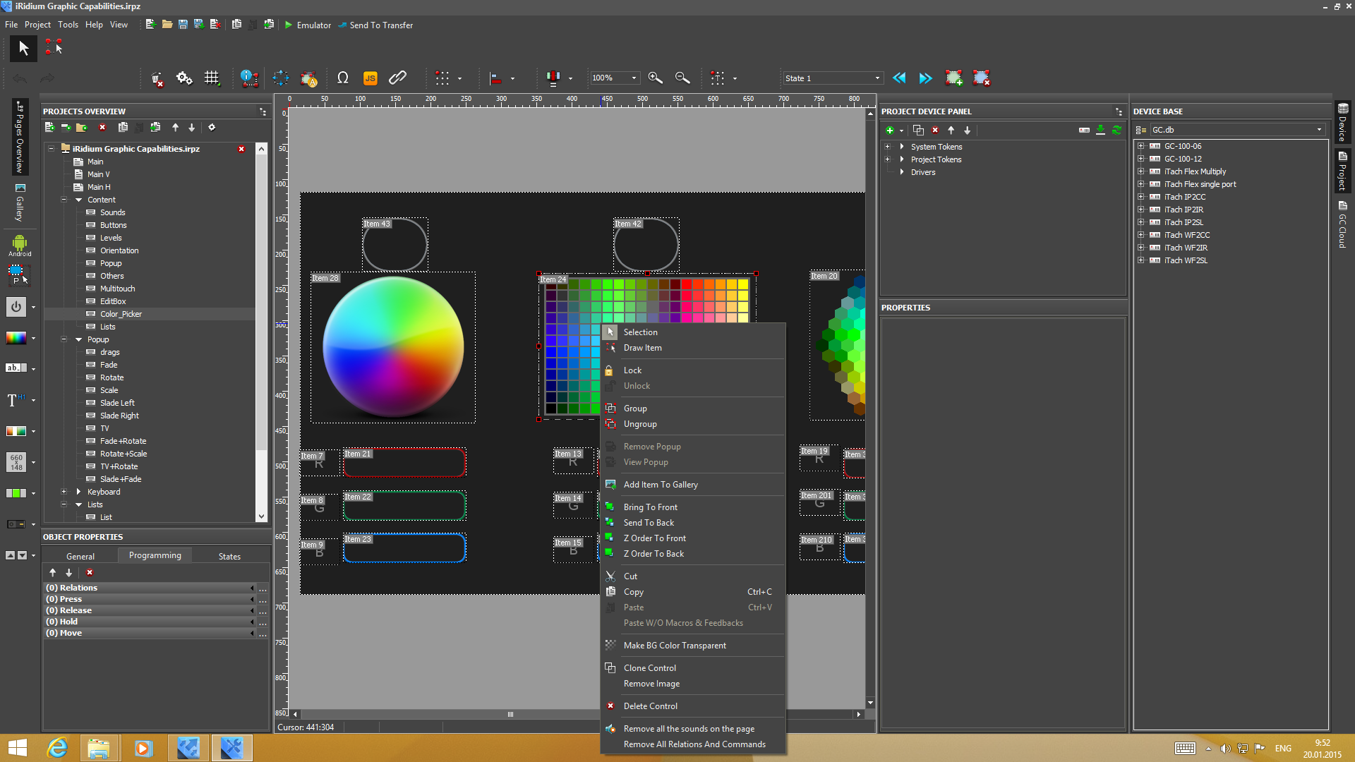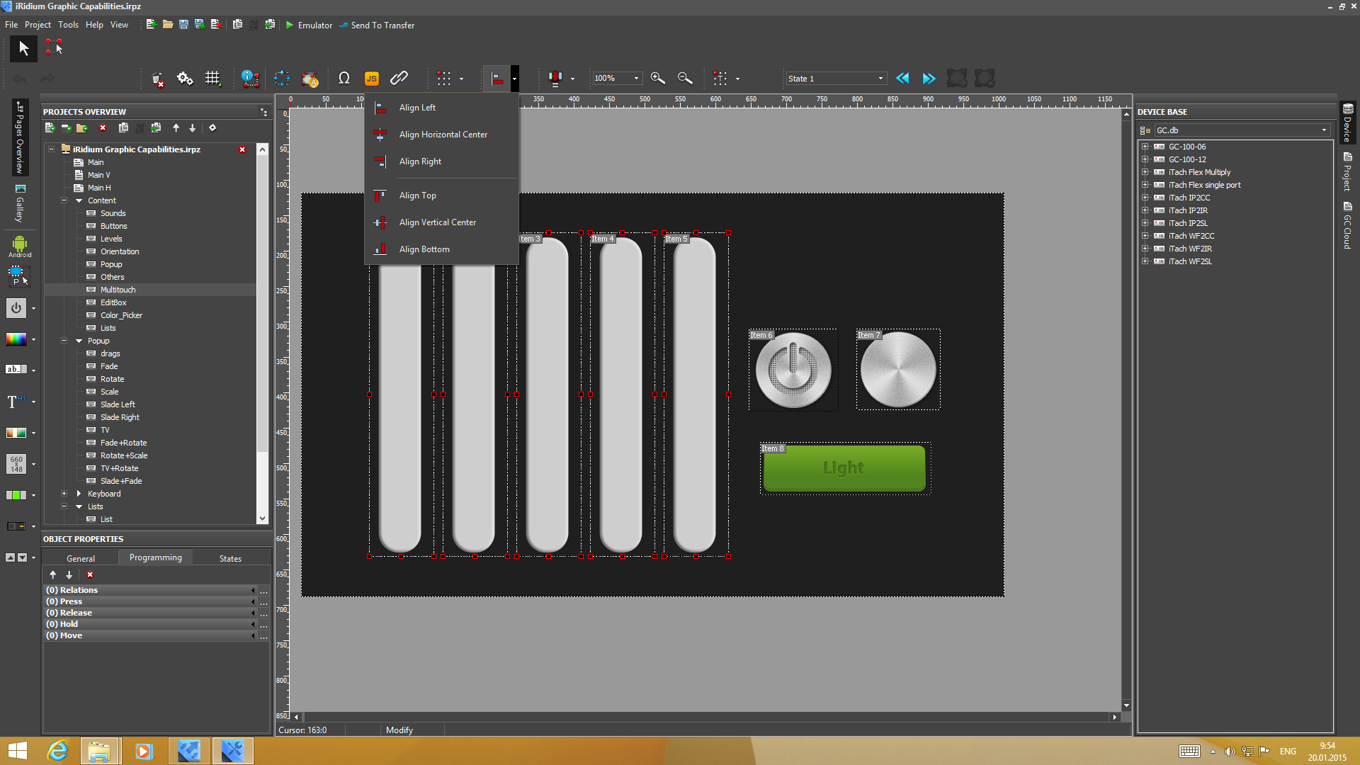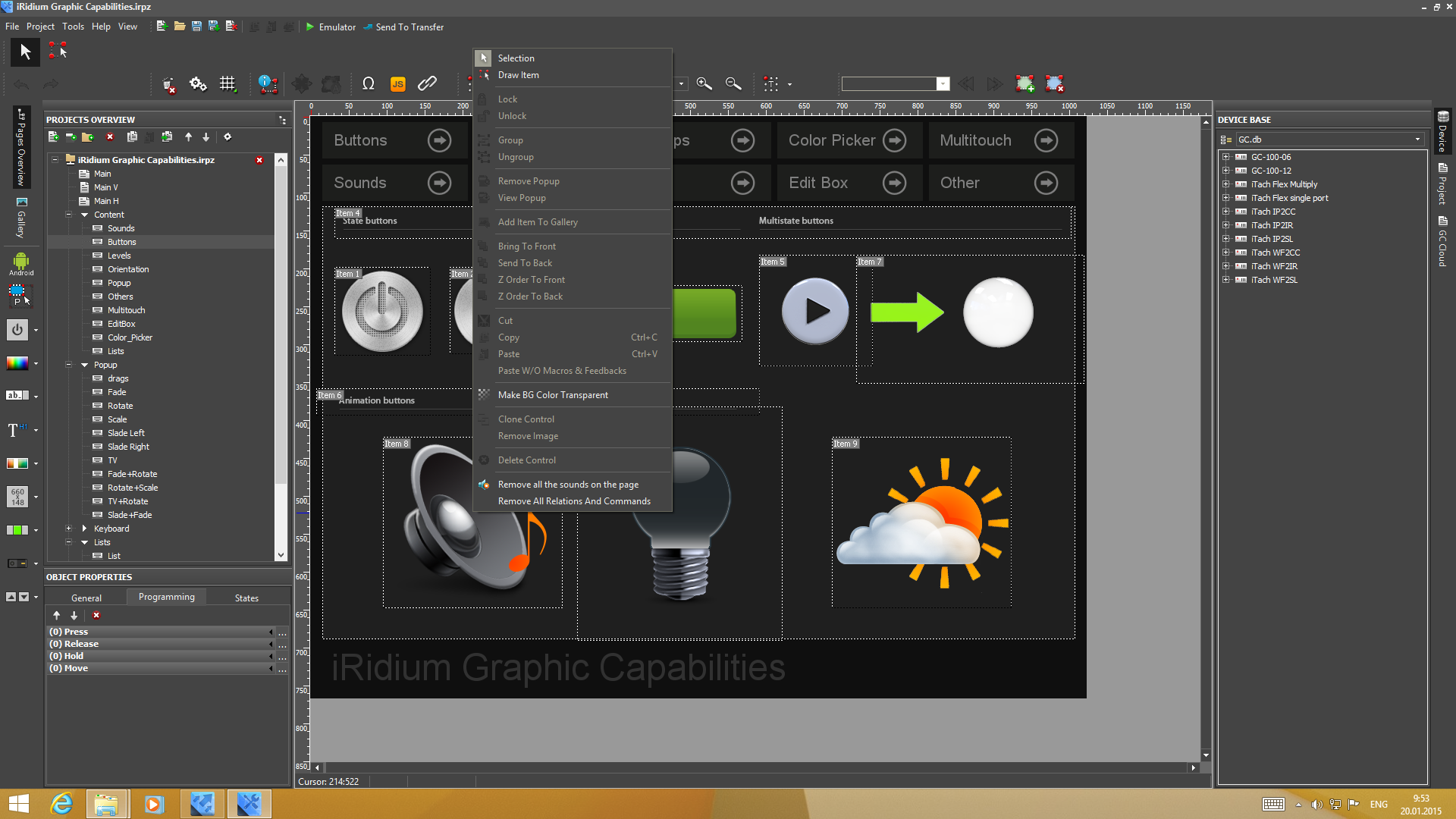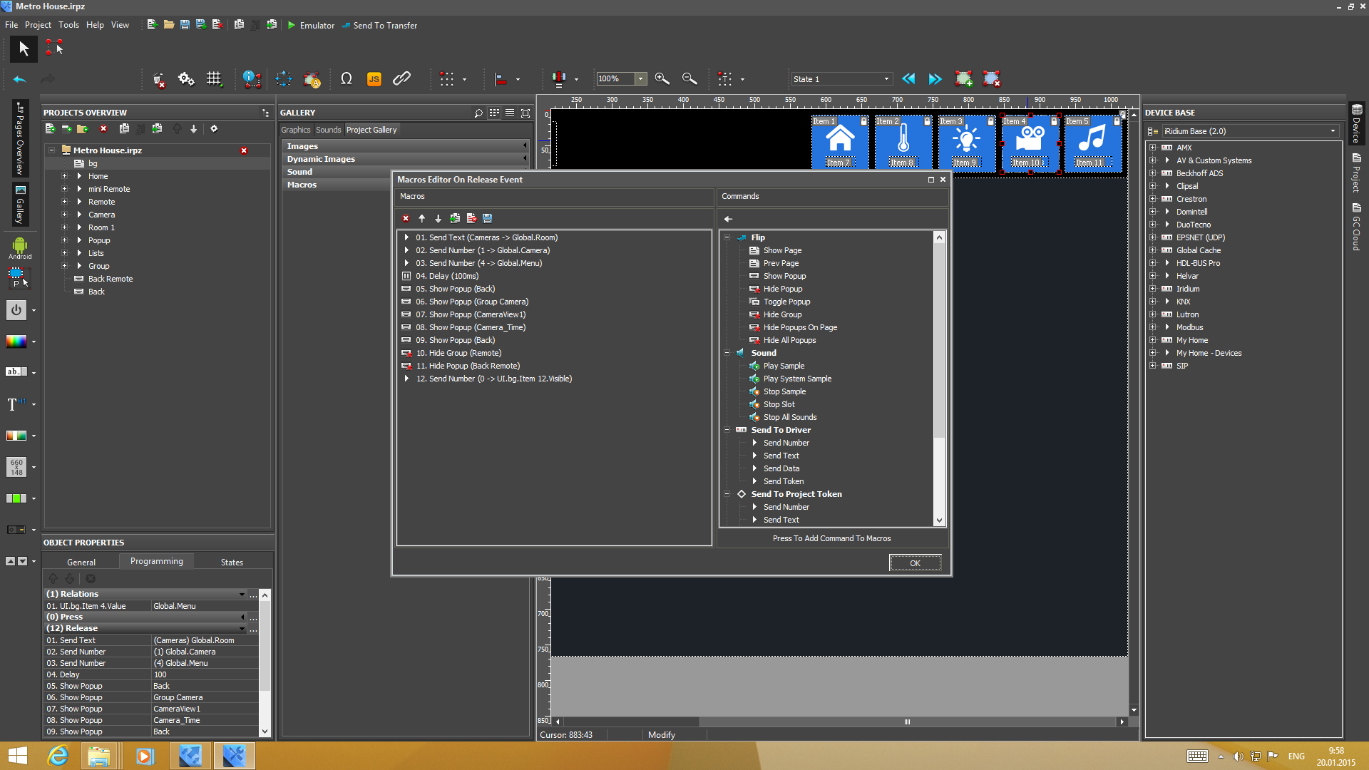 Для работы над проектами используется программа iRidium GUI Editor. Эта многофункциональная утилита имеет встроенные средства для работы над графической составляющей проекта, управления используемыми устройствами и программирования команд. Решение обеспечивает гибкость для реализации любых визуальных эффектов — на страницах интерфейса можно использовать фоновые изображения, кнопки разных дизайнов, слайдеры, текст с собственными шрифтами, анимацию и другие элементы. Например, можно сделать страницу с планом дома для контроля и выбора требуемой комнаты или добавить фотографию помещения с меняющими вид светильниками. Дополнительные возможности обеспечиваются использованием всплывающих окон в дополнение к обычным страницам.