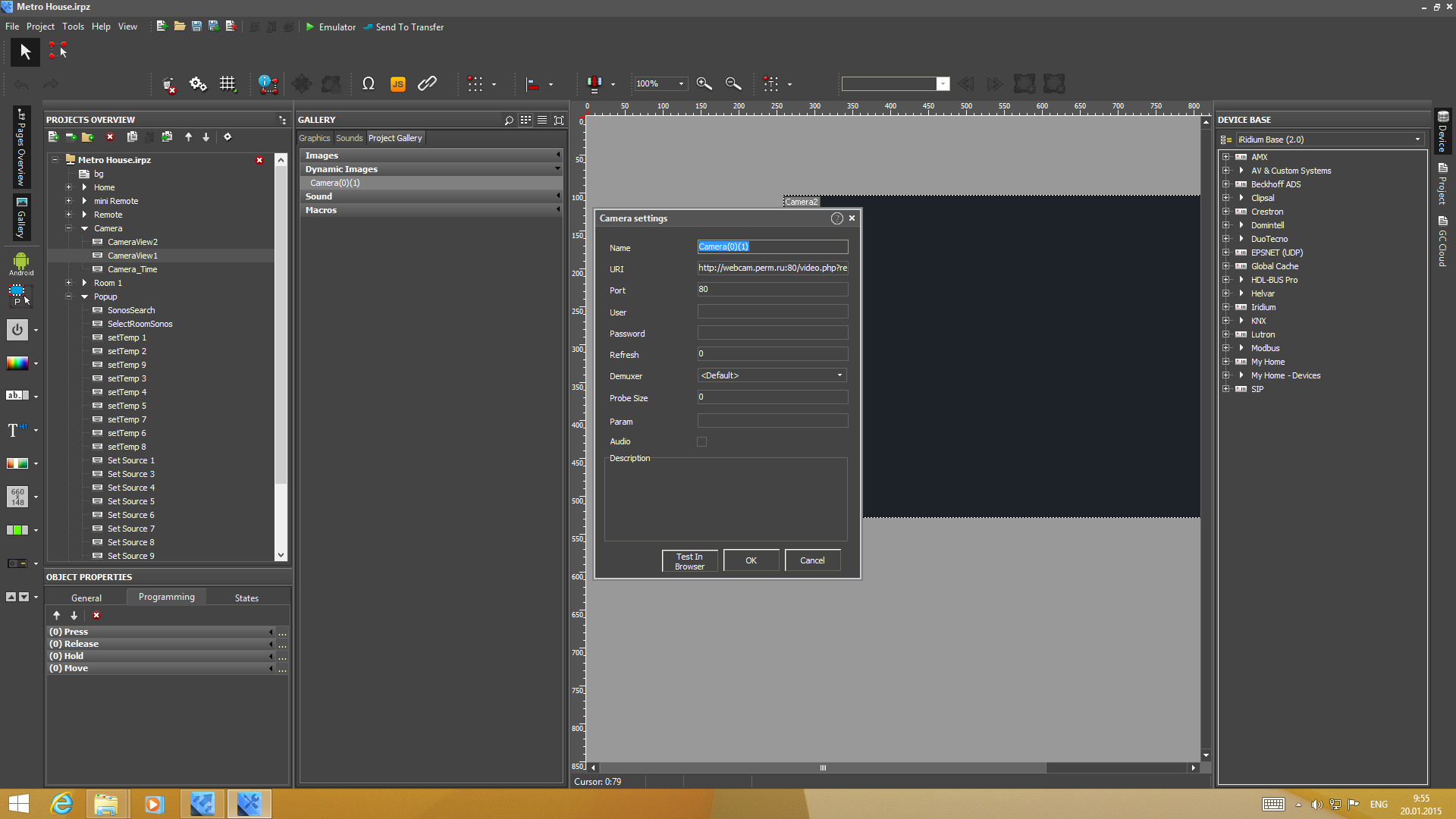 Для реализации трансляций с IP-видеокамер используется упомянутая выше технология динамических изображений. Решение поддерживает отображение видео практически с любой модели камеры. Требуется только иметь трансляцию по http- или rtsp-ссылке с кодеками H.264 или MJPEG. Производитель рекомендует использовать не более 4-5 активных трансляций на одной панели. Что касается управления PTZ, то его можно реализовать через драйвер AV & Custom Systems.