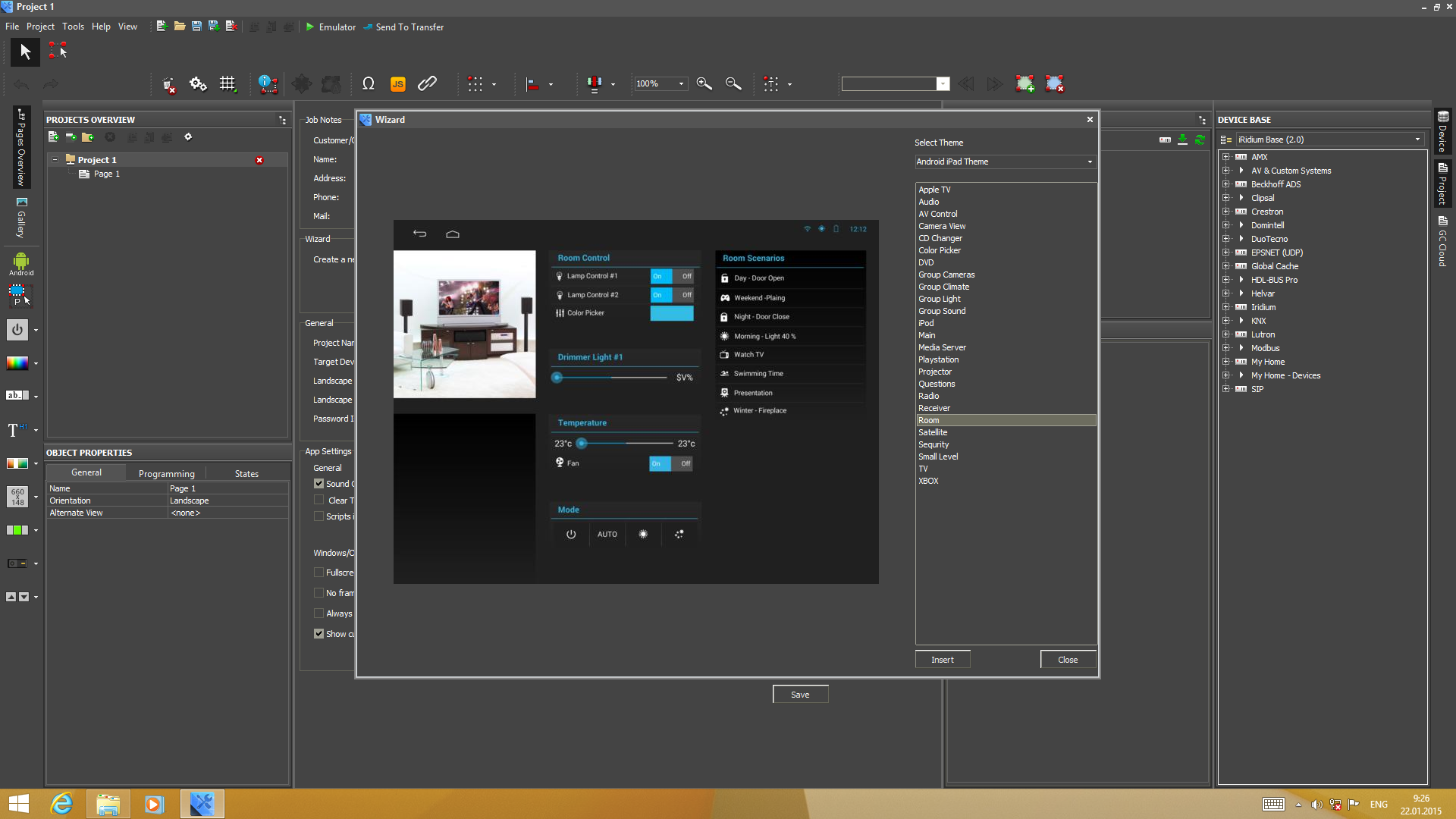 Еще одним вариантом для быстрого начала работы является использование встроенного помощника. В нем вы выбираете одну из доступных тем и потом добавляете требуемые вам страницы (например, для управления светом, кондиционером или медиаплеером) из нее в свой проект. Остается только настроить взаимосвязи страниц и всплывающих окон, а также работу с оборудованием.