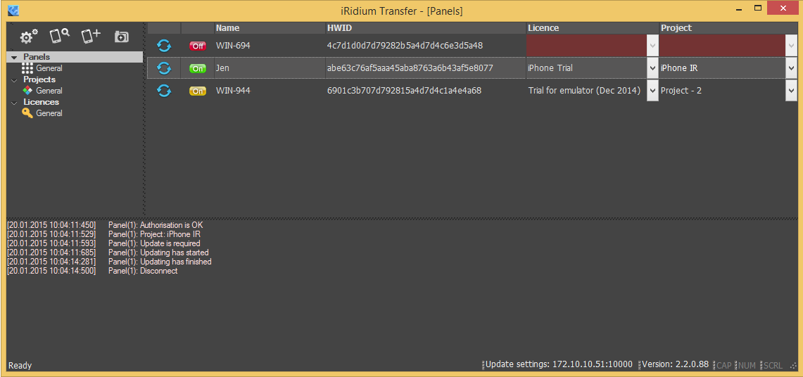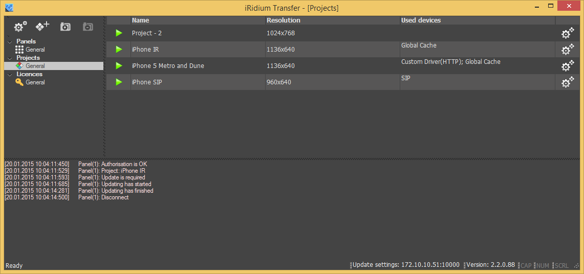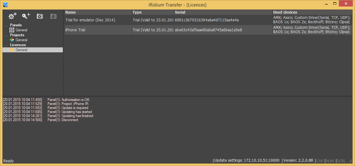 Файлы лицензии используются в программе iRidium Transfer, которая предназначена для загрузки кода проекта на панели. В этой программе представлены три списка — устройства (панели), лицензии и проекты. Списки могут быть упорядочены с использованием подпапок.
