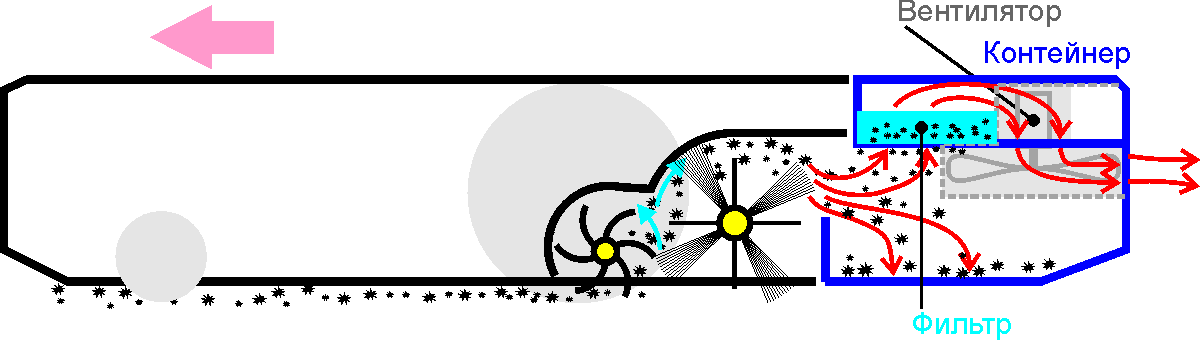 Основных щеток две, они вращаются навстречу друг другу. Сначала резиновая щетка-скребок перемещает крупный мусор, затем вторая щетка со щетиной и скребками подхватывает крупный и мелкий мусор и перебрасывает его в пылесборник. Инерционное перемещение мусора дополнено воздушным потоком, который проходит через вращающиеся щетки и два HEPA-фильтра, задерживающие весь мелкий мусор. Примерная схема, представленная ниже, демонстрирует основной принцип сбора мусора: