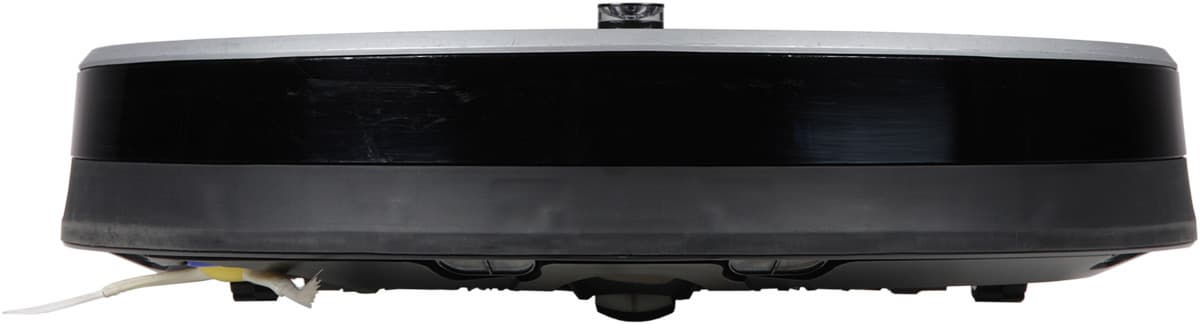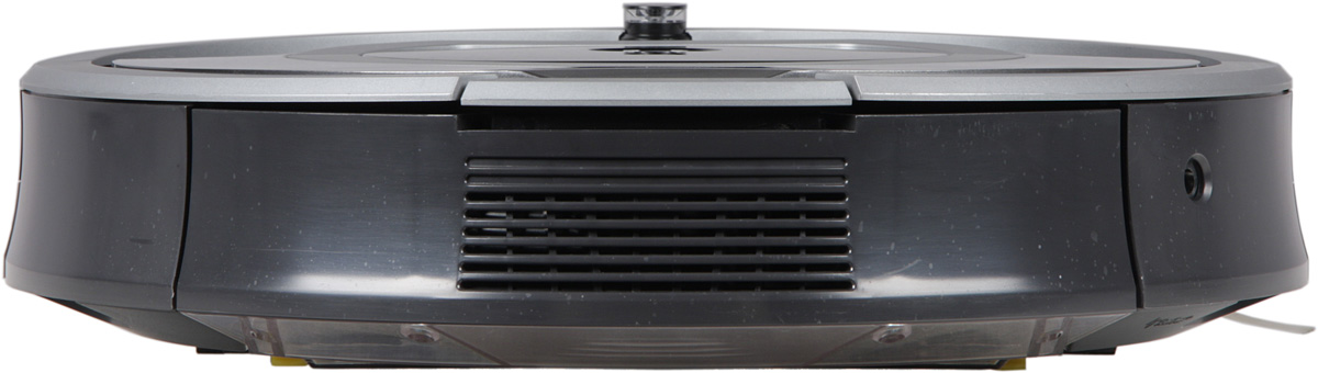 В самом центре верхней панели находится круглая кнопка с зеркально-гладкой хромированной поверхностью. Ободок этой кнопки, значок и надпись на ней подсвечиваются светодиодным индикатором, меняющим цвет от зеленого до красного в зависимости от состояния АКБ. Сверху есть откидывающаяся вверх на небольшой угол ручка, за которую пылесос удобно переносить. Под ручкой спрятан прикрытый резиновой заглушкой сервисный разъем. Нижняя часть бампера окантована резиновой вставкой, верхняя половина бампера прикрыта вставкой из пластика черного с виду, но прозрачного для ИК-излучения.