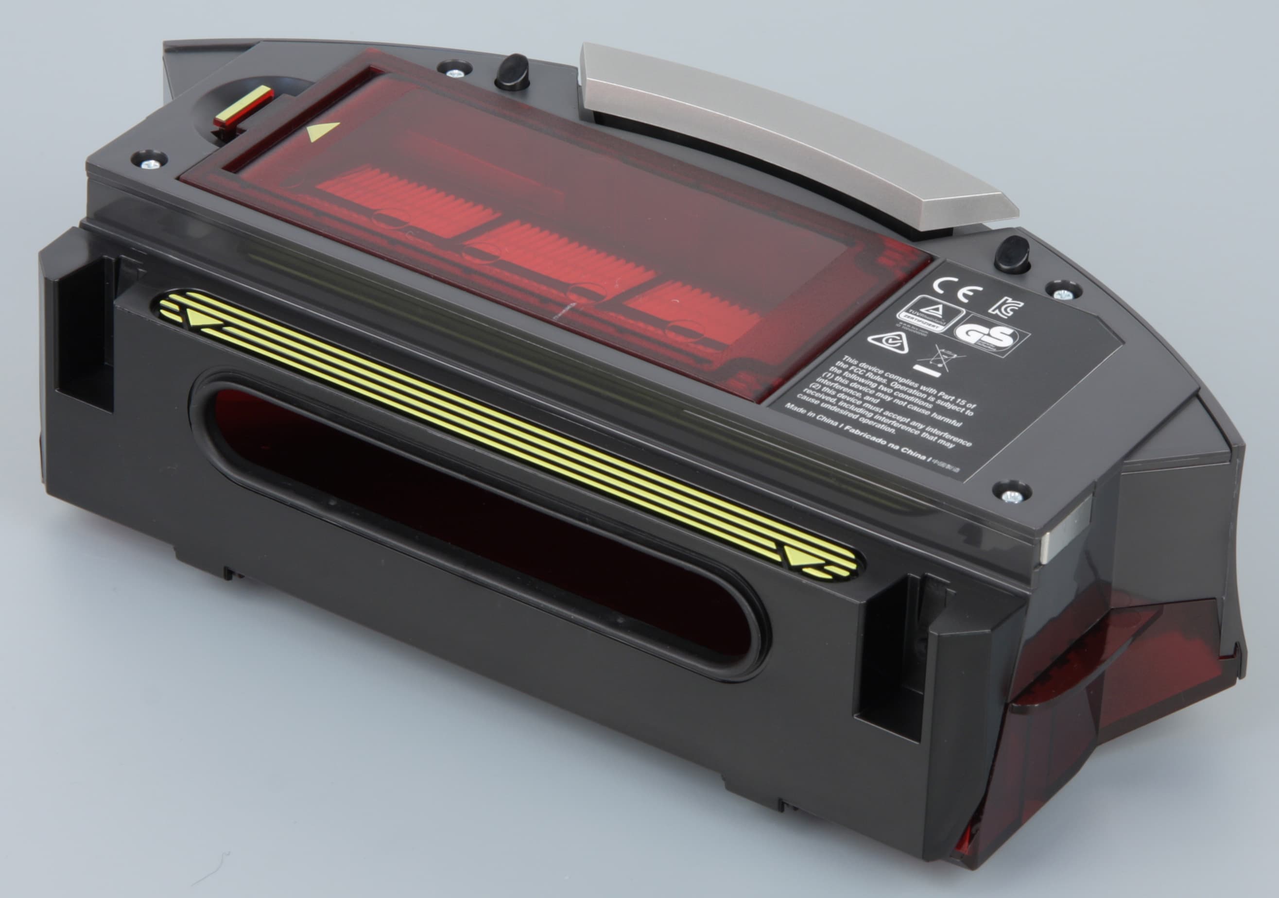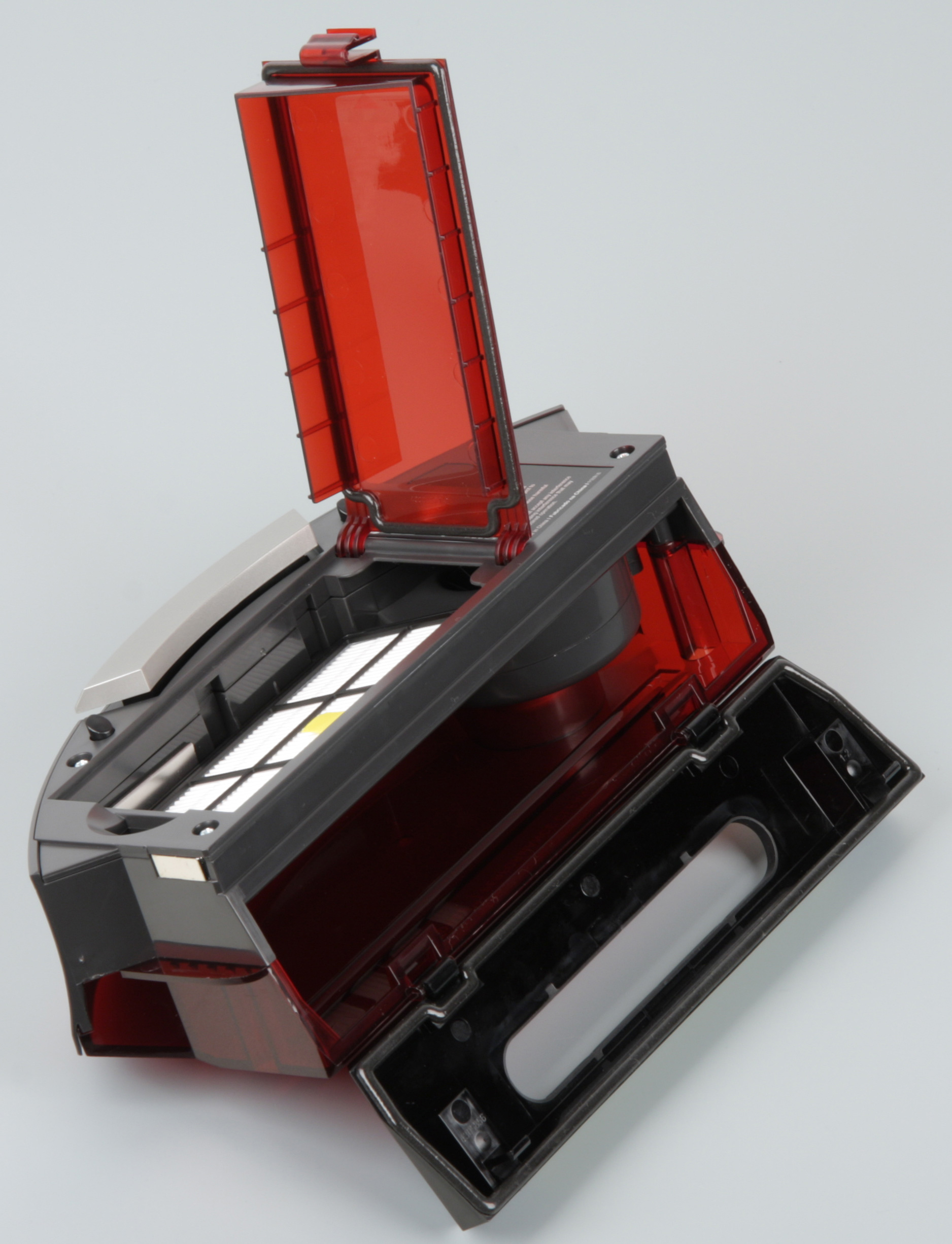 Днище пылесборника выполнено из прозрачного тонированного красным пластика, но прозрачной оставлена только узкая полоска, остальная поверхность заматирована, поэтому визуально, просто осмотрев робота, о степени заполнения пылесборника судить сложно.