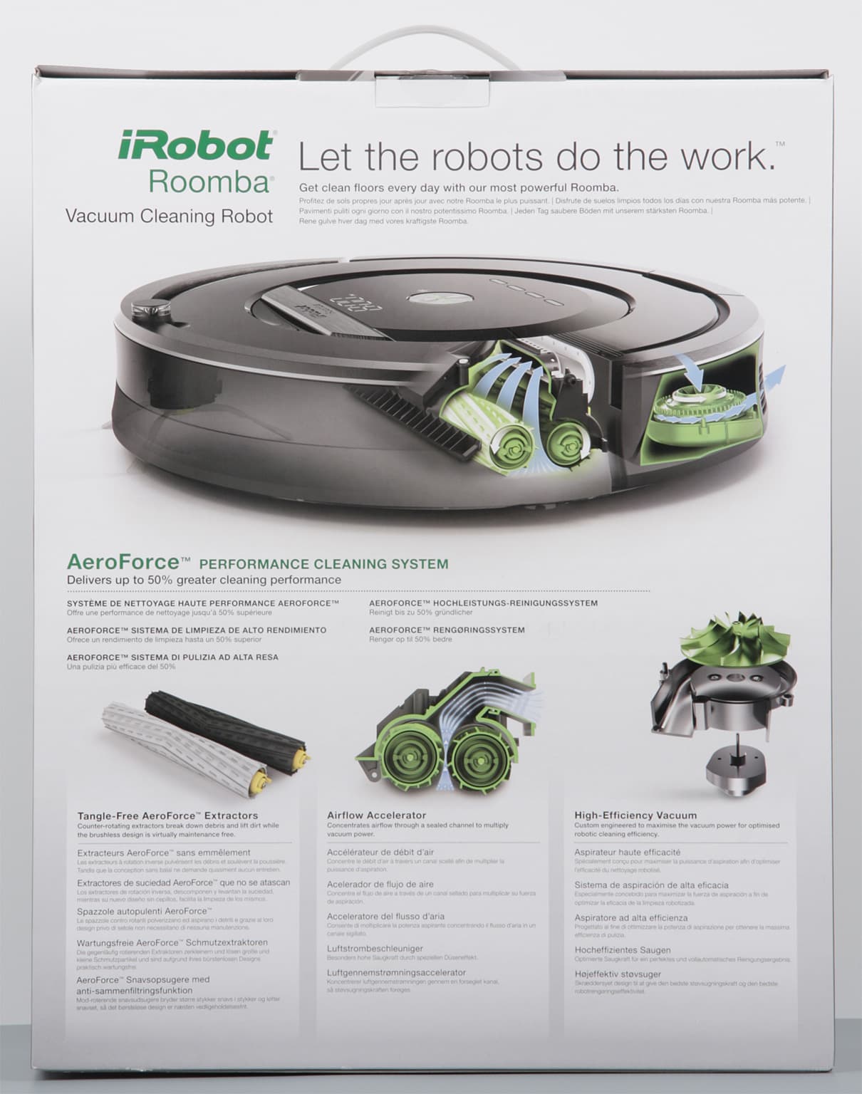 | Особенности | HEPA-фильтр, определение заполнения пылесборника, датчик загрязнения Dirt Detect 2 (акустический и оптический сенсоры), система «антипутаница», поддержка виртуальных стен и ограничителей |