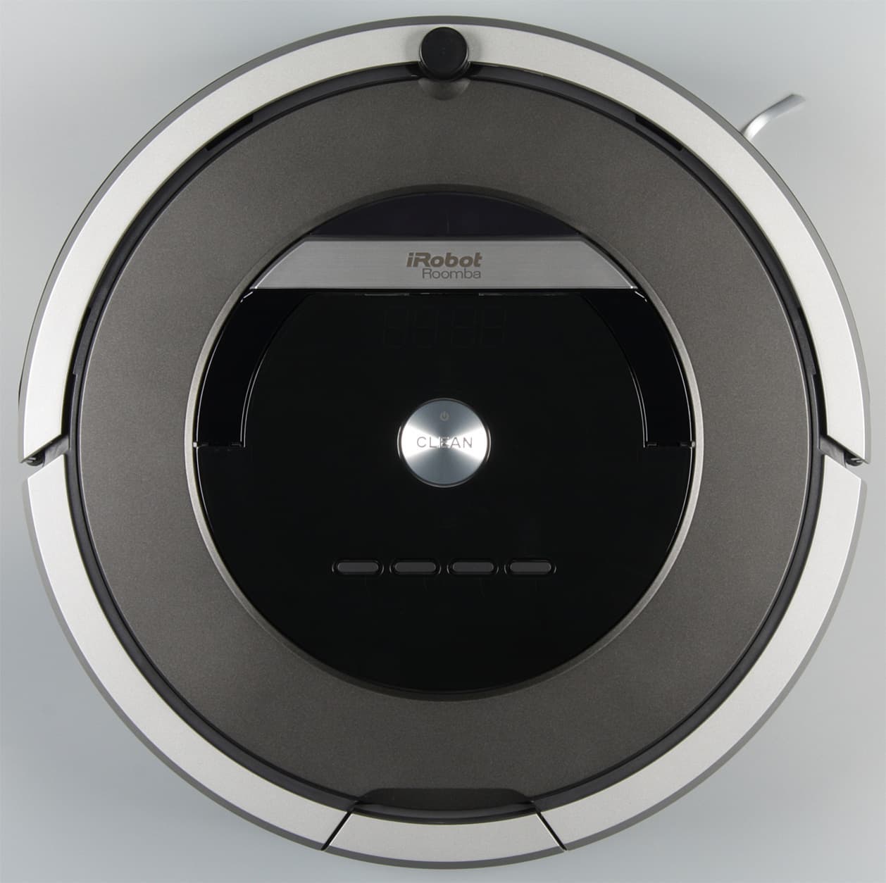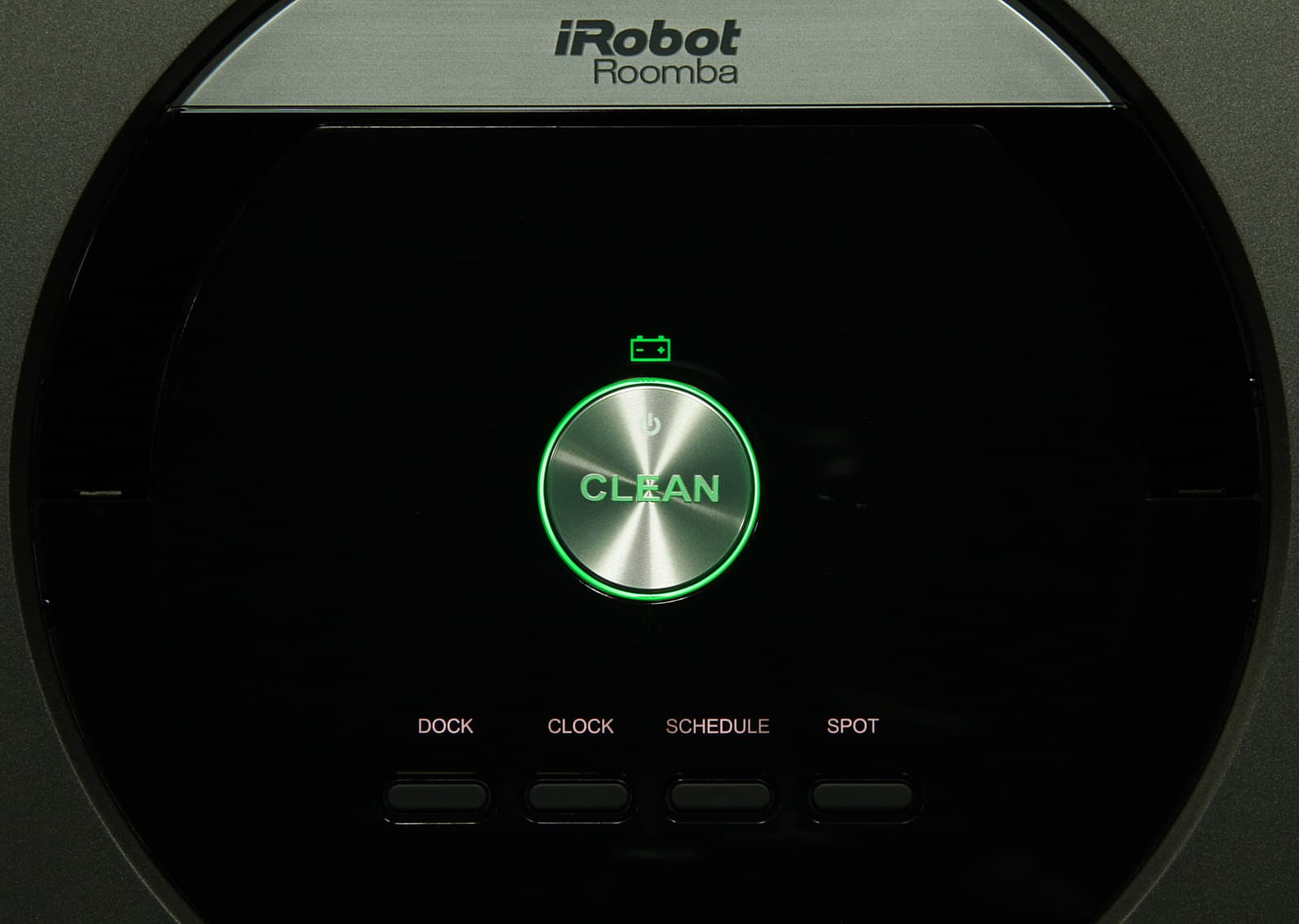 В самом центре верхней панели находится круглая кнопка с серебристым покрытием. Ободок этой кнопки, значок и надпись на ней подсвечиваются зеленым, когда робот находится в активном состоянии. Все кнопки механические. Сверху есть откидывающаяся вверх на небольшой угол ручка, за которую пылесос удобно переносить. Тут есть небольшой эргономический просчет — ручка приподнимается за переднюю часть, но углубление для захвата пальцами очень мелкое. Под ручкой спрятан прикрытый резиновой заглушкой сервисный разъем (используется в частности для обновления программного обеспечения).