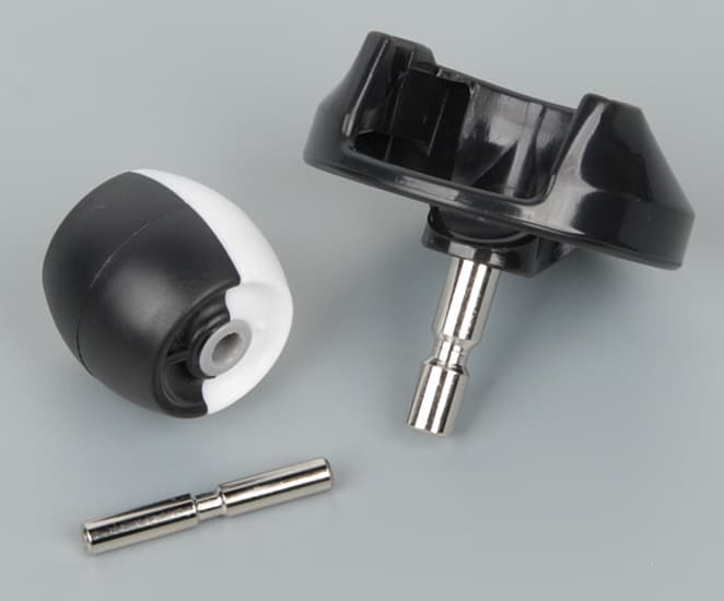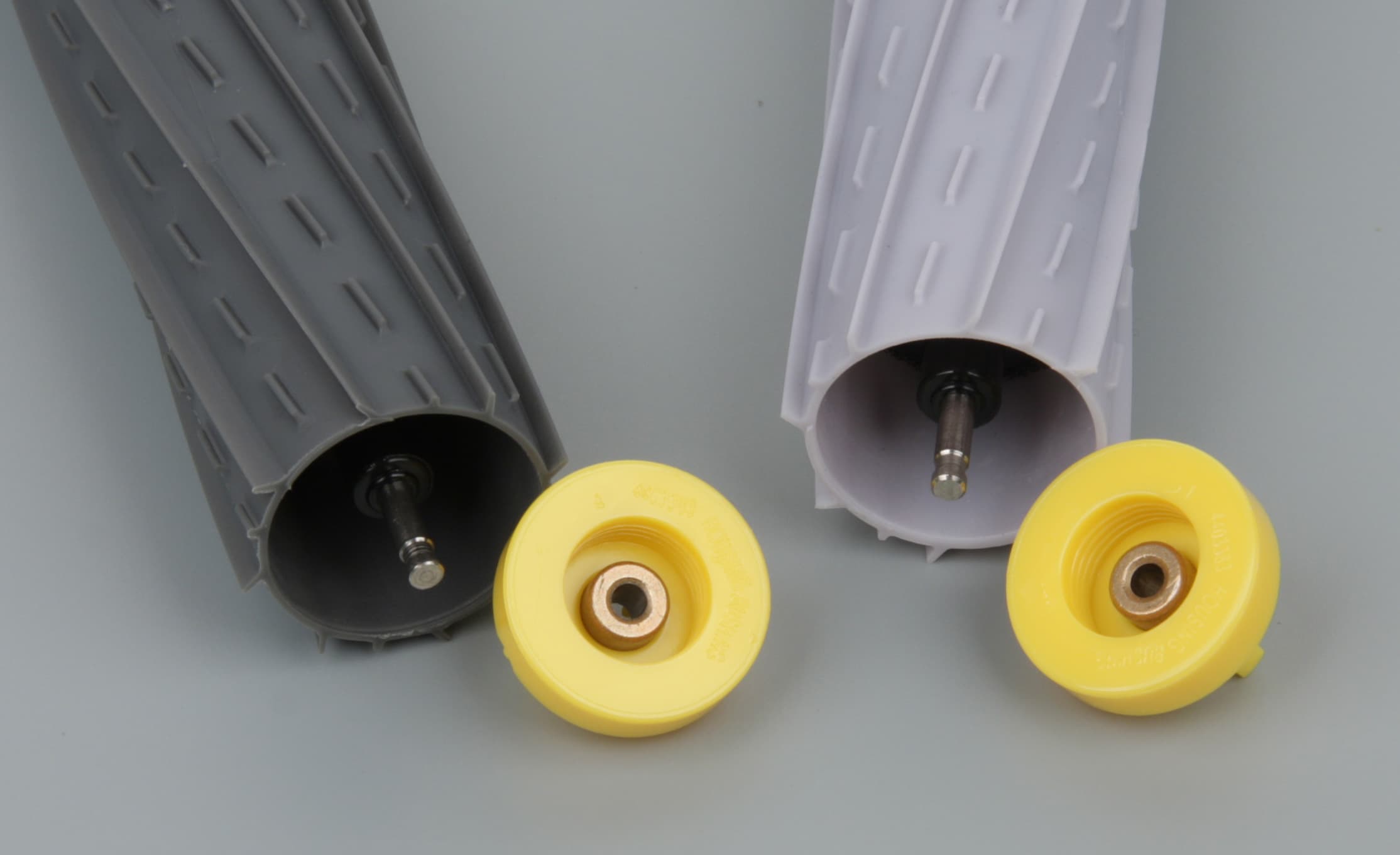 Основных щеток две, они вращаются навстречу друг другу. В 800-й это не совсем щетки, так как они лишены ворса, но мы будем по привычке называть их щетками (в русском руководстве используется сложное название валики-скребки, в английском — extractor). Две щетки не взаимозаменяемые, но конструкцию имеют одинаковую: внешний упругий цилиндр с ребрами (не резиновый, а скорее из силикона), закрепленный на оси из твердого пластика. С одной стороны эта ось продолжена шпилькой из нержавеющей стали, на которую надета желтая пластиковая втулка с бронзовым подшипником скольжения.