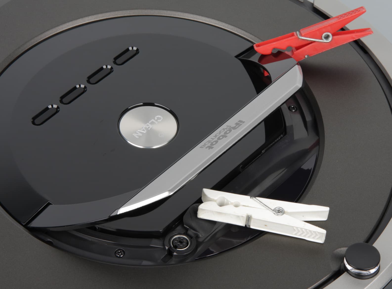 Нижняя часть бампера окантована резиновой «юбочкой», предохраняющей мебель от царапин. Верхняя половина бампера прикрыта вставкой из пластика черного с виду, но прозрачного для ИК-излучения. Вверху по центру бампера — обзорный выступающий вверх ИК-датчик, который собственно и определяет минимальную высоту просвета предметов обстановки, под которые пылесос еще может забраться.