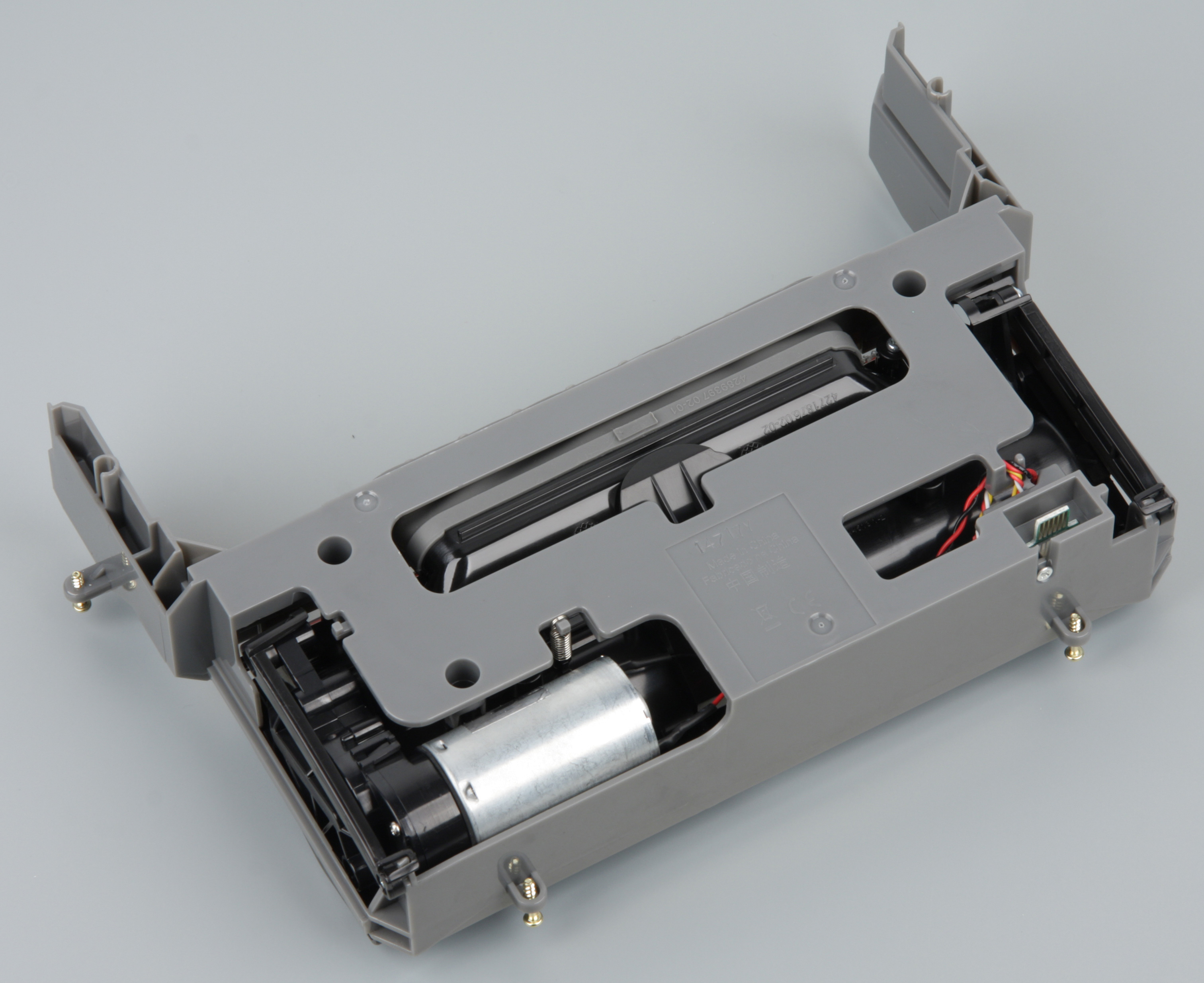 В блоке питания реализована распространенная схема обратноходового импульсного преобразователя с контролем выходного напряжения (21 В), дополненная ограничением на максимальный ток на уровне 1,25 А. Тем самым на БП возложена частичная задача контроллера зарядки аккумуляторной батареи робота — поддержка постоянного тока в первой фазе зарядки. Модульная конструкция базы позволяет в крайнем случае заменить вышедший из строя штатный блок питания на внешний БП с аналогичными параметрами. В качестве которого после небольшой доработки (чуть поднять выходное напряжение и снизить пороговое значение тока) можно использовать практически любой БП для ноутбука. Но, разумеется, проще просто купить новую оригинальную базу. Отметим, что в первичной цепи блока питания теперь нет варистора. С одной стороны это хорошо, так как скачки напряжения не будут приводить к перегоранию предохранителя в БП, с другой — плохо, так как отсутствие защиты от перенапряжения повышает вероятность перехода БП в практически неремонтопригодное состояние из-за массового выгорания компонентов в первичной высоковольтной цепи. Отметим, что некоторые пользователи, которым повезло с очень низким уровнем шума в помещении, жалуются на щелчки, издаваемые БП. Действительно, блок питания в базе, которой комплектовался протестированный ранее Roomba 880, имел подобный дефект. Однако экземпляр БП от 870 работал практически бесшумно. Надеемся, что это не нам повезло, а производитель раз и навсегда разобрался с данной проблемой. Вторым недостатком новой базы являются гладкие контактные площадки (на старой базе на них были выступы). В результате контакты хуже очищаются при парковке робота, и пользователю приходится чаще чистить контакты на роботе и на базе вручную. Под черным пластиковым кожухом на плате управления можно обнаружить два ИК-диода, разделенные непрозрачной перегородкой.