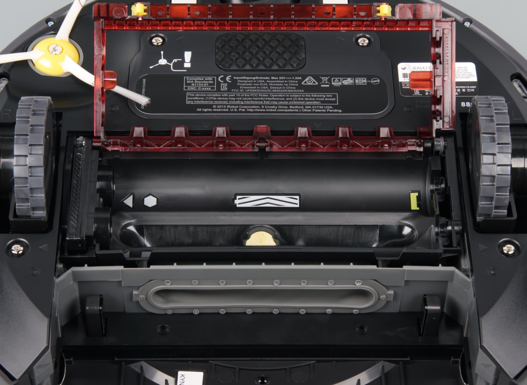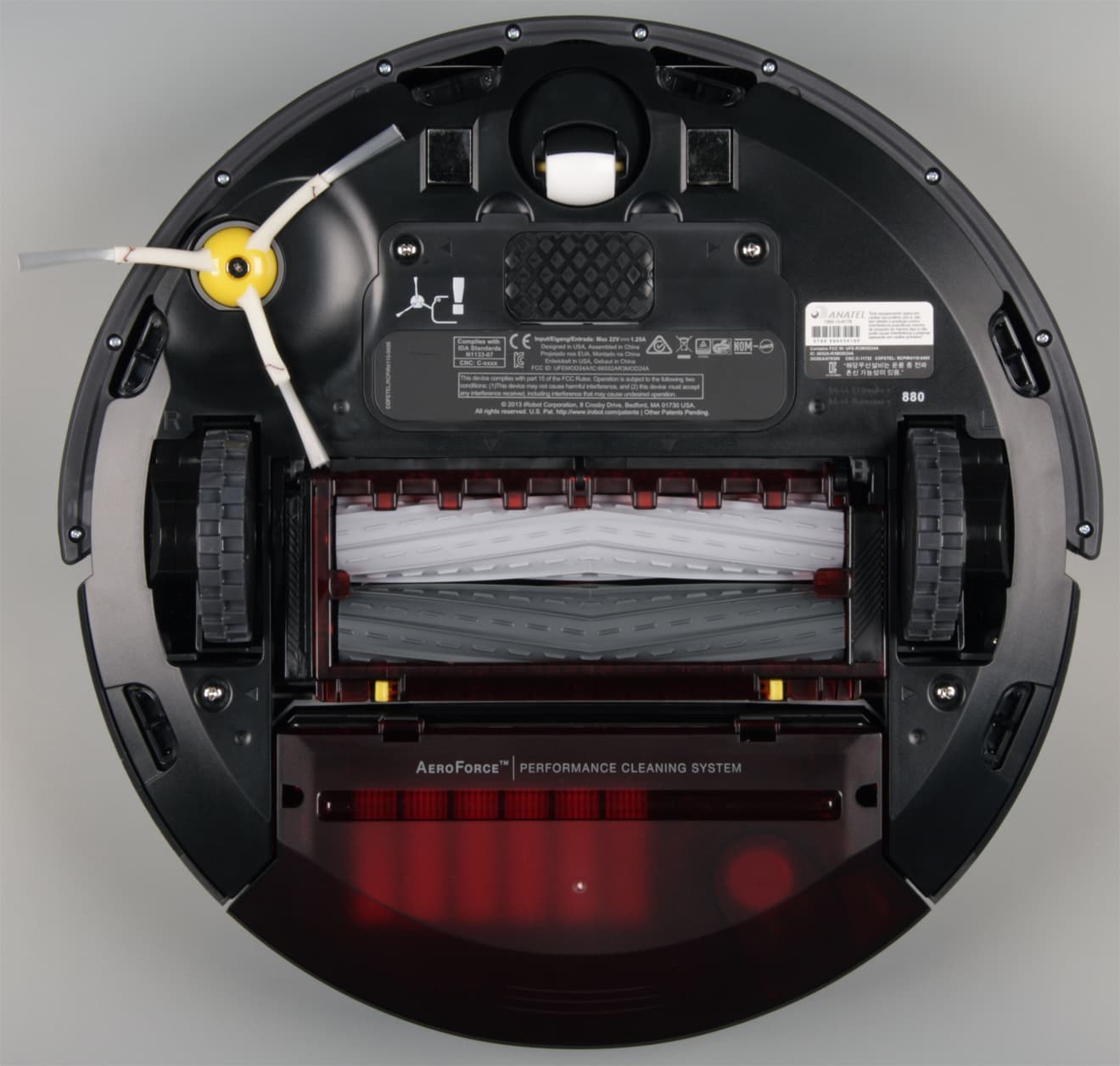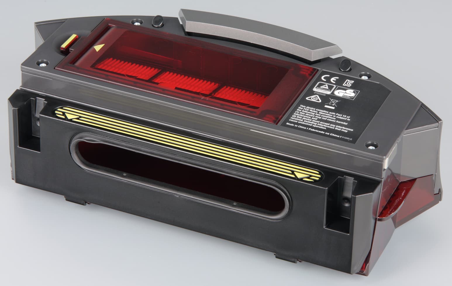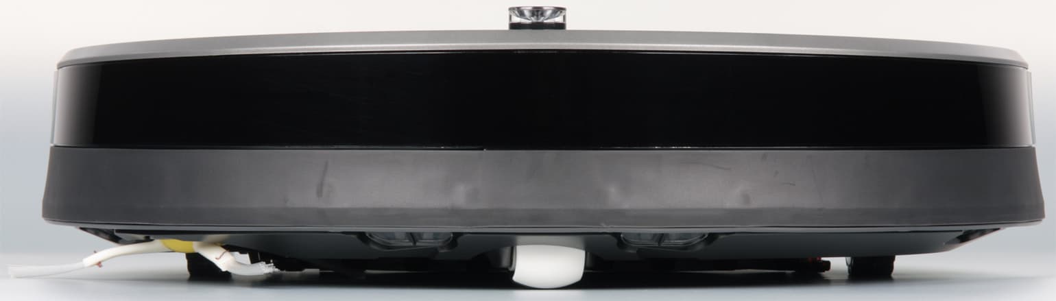 Верхняя половина бампера прикрыта вставкой из пластика черного с виду, но прозрачного для ИК-излучения. Вверху по центру бампера — обзорный выступающий вверх ИК-датчик, который собственно и определяет минимальную высоту просвета предметов обстановки, под которые пылесос еще может забраться. Перевернув пылесос вверх днищем, мы видим две контактные площадки, подруливающий ролик, боковую щетку, крышку отсека АКБ, два ведущих колеса на подпружиненных рычагах, отсек с основными щетками и днище отсоединяемого пылесборника.