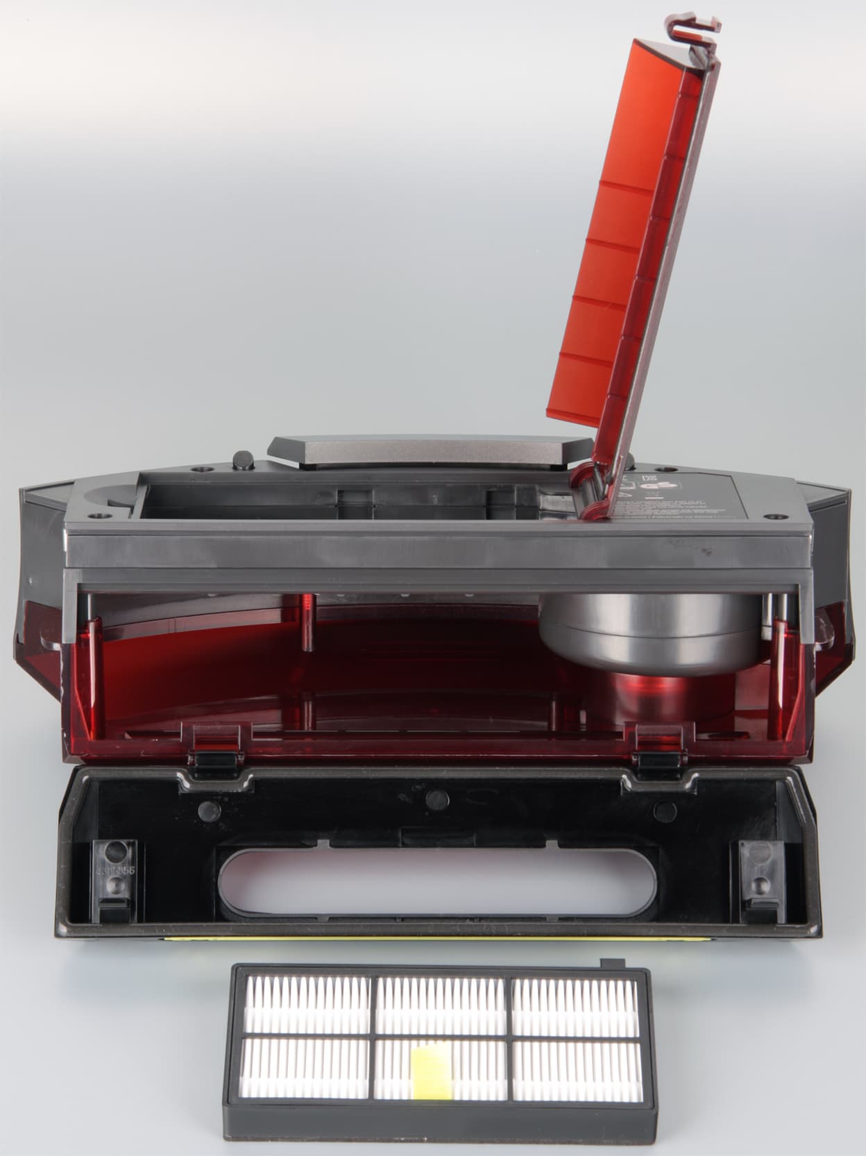 Днище пылесборника выполнено из прозрачного тонированного красным пластика, но прозрачной оставлена только узкая полоска, остальная поверхность заматирована, поэтому визуально, просто осмотрев робота, о степени заполнения пылесборника судить сложно. Очищать пылесборник относительно просто: откидывается шторка и пыль вытряхивается. Затем вынимается и очищается HEPA-фильтр.