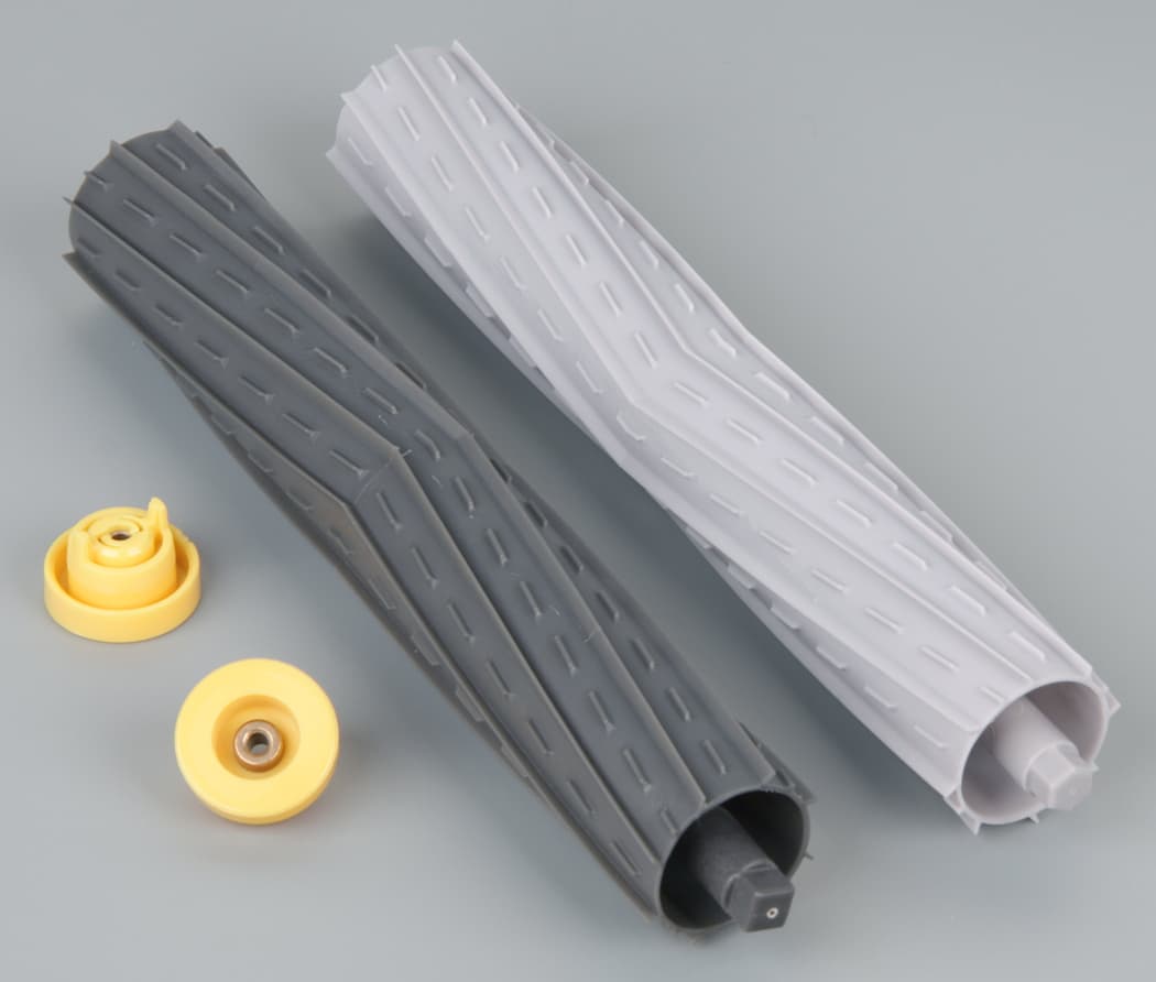 Основных щеток две, они вращаются навстречу друг другу. В 800-й это не совсем щетки, так как они лишены ворса, но мы будем по привычке называть их щетками (в русском руководстве используется сложное название валики-скребки, в английском — extractor). Прецеденты есть — первые щетки для очистки ветрового стекла автомобилей также были со щетиной, а сейчас они трансформировались в резиновые скребки, но название детали осталось прежним. Щетки не взаимозаменяемые, но конструкцию имеют одинаковую: внешний упругий цилиндр с ребрами (не резиновый, а скорее из силикона), закрепленный на оси из твердого пластика.