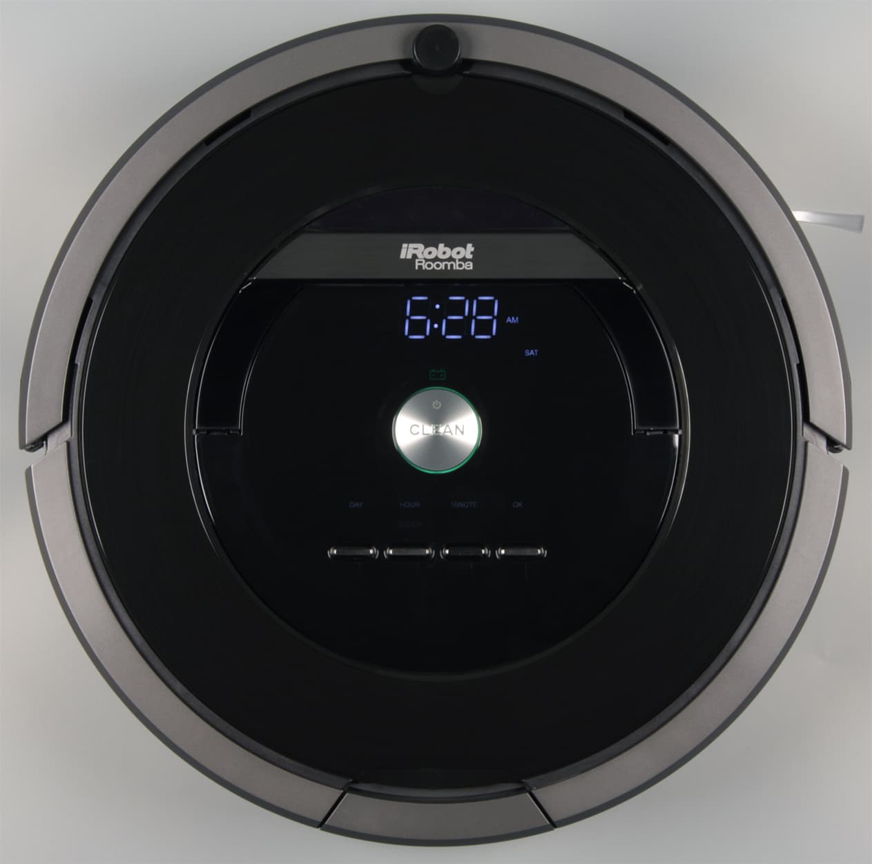 В самом центре верхней панели находится круглая кнопка с серебристым покрытием и концентрическими канавками под точеный металл. Ободок этой кнопки, значок и надпись на ней подсвечиваются зеленым, когда робот находится в активном состоянии. Все кнопки механические. Сверху есть откидывающаяся вверх на небольшой угол ручка, за которую пылесос удобно переносить.