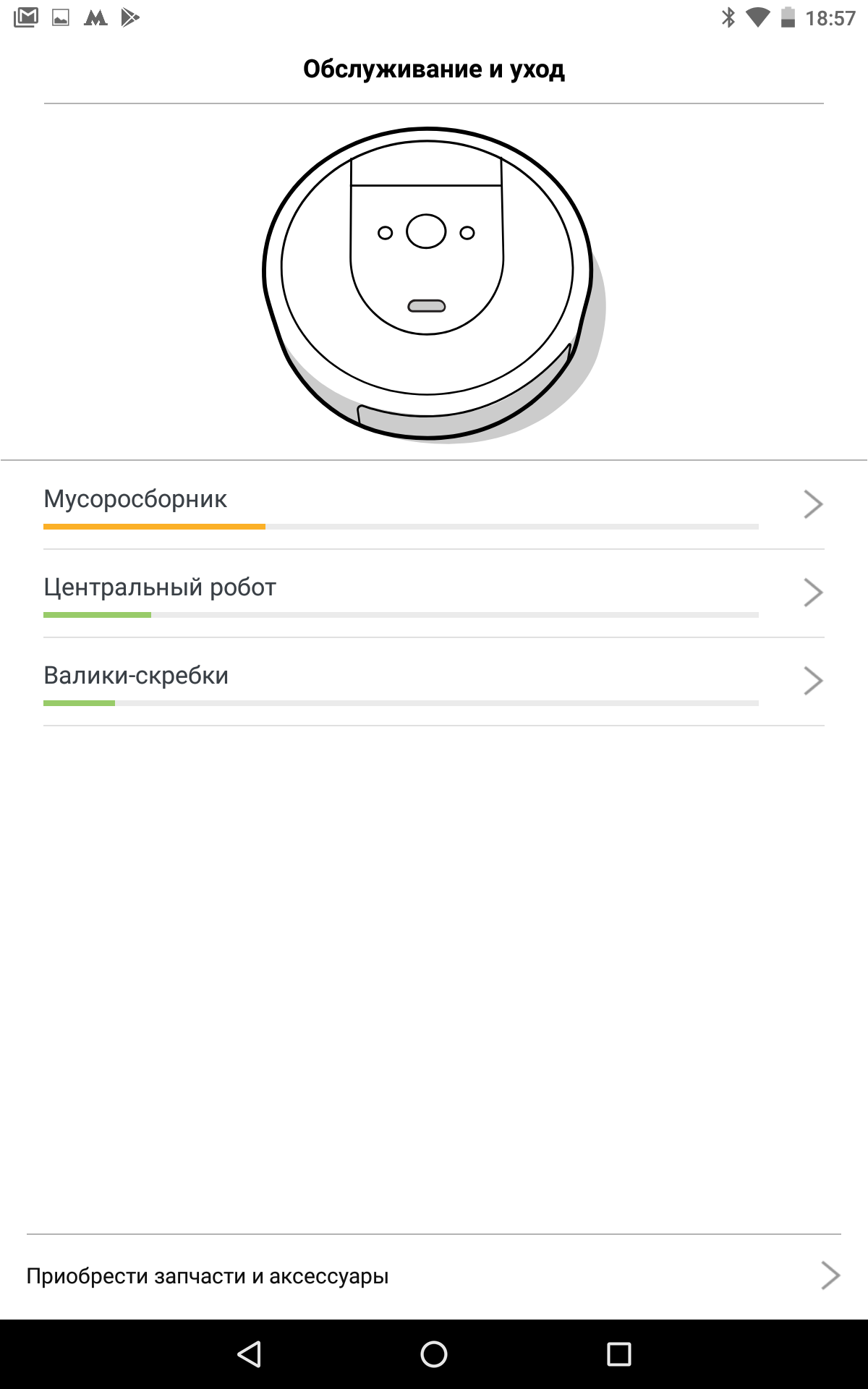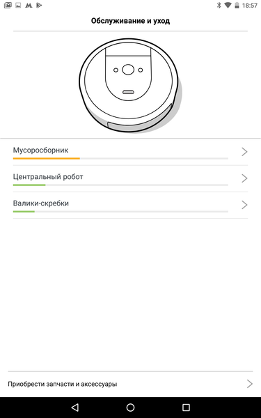 В принципе, использовать робота, можно без приложения и не подключая его к Сети, но со смартфона или планшета меняются недоступные иначе настройки робота, именно с помощью iRobot Home можно задать расписание работы на неделю (везде или с выбором комнат, однократно или раз в неделю в выбранные дни, в один или в два прохода, или в автоматическом режиме), приложение поможет понять, в каком состоянии сейчас робот, покажет текстовое подробное руководство, даст ответы на часто задаваемые вопросы и даже подскажет, что пора заменить, и поможет купить запасные части, и т. д., и т. п. И все это на понятном русском языке (хотя переводчикам нужно научиться понимать различие между действиями «убирать» и «убираться»).