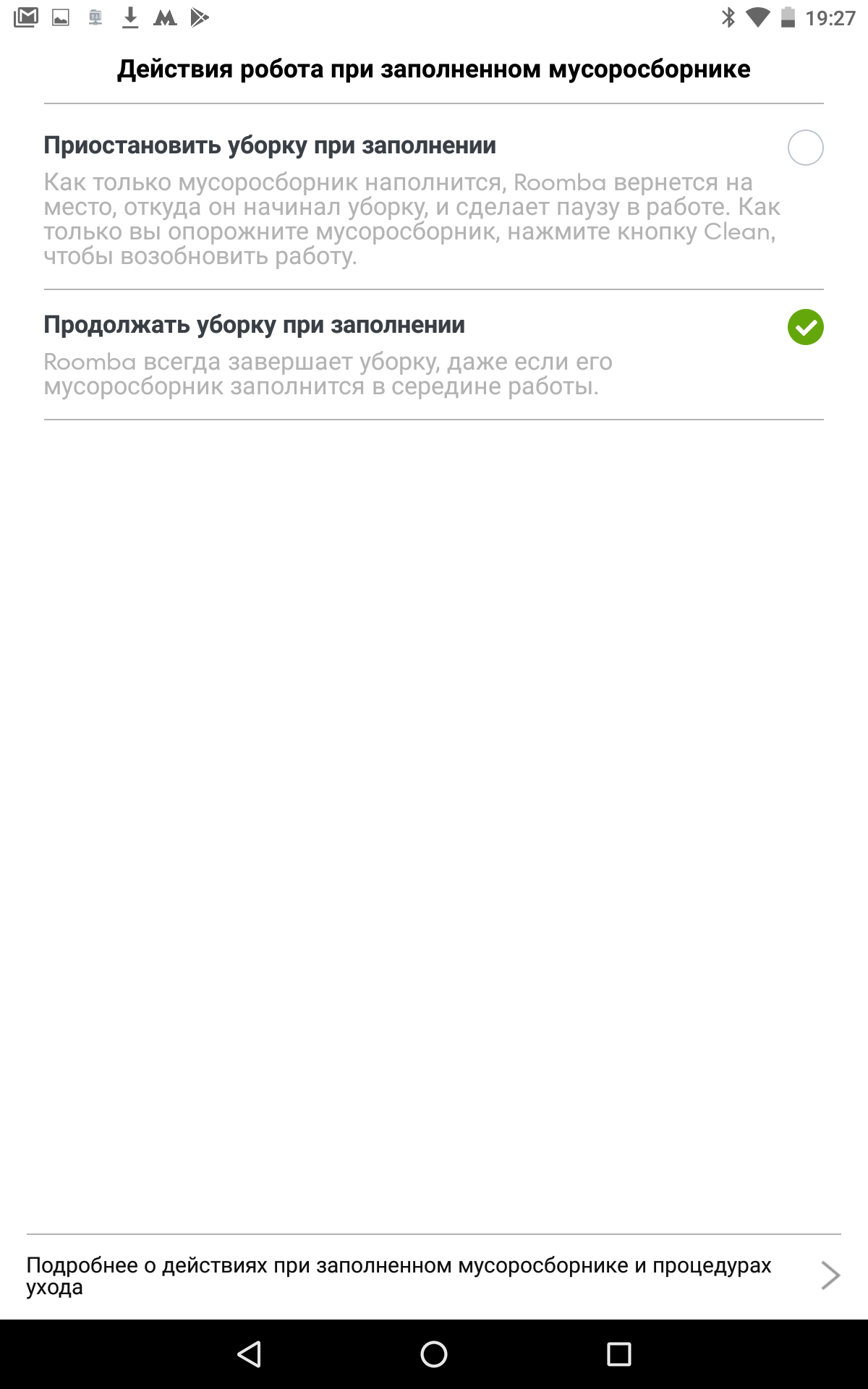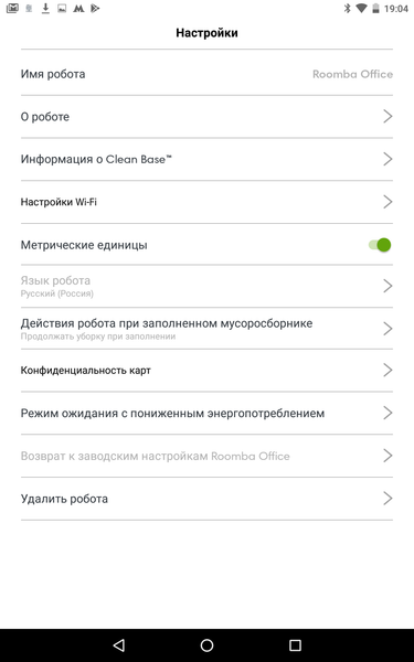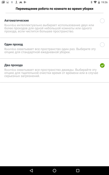 При использовании мобильного приложения становятся доступными две опции: выполнять уборку за один проход, за два или за два и более для малых помещений и за один для больших (так по умолчанию); продолжать работу при заполненном пылесборнике или приостановить уборку при его переполнении.