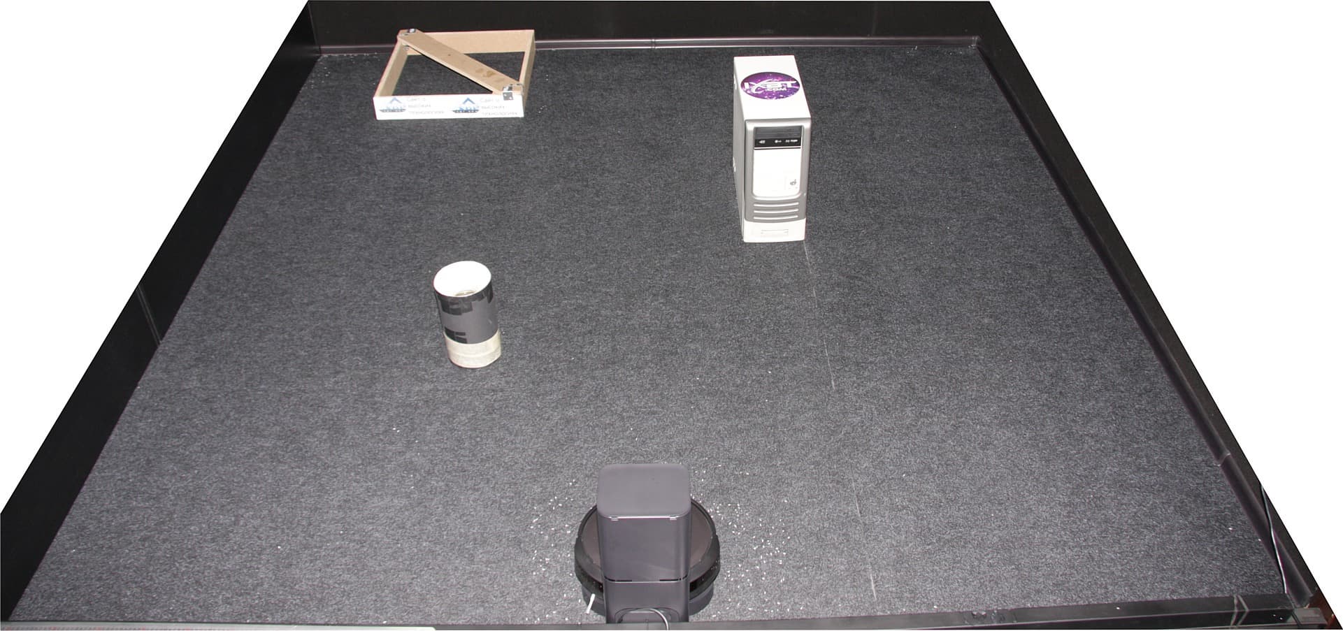 При приближении к препятствию, которое робот может определить ИК-датчикам, он немного замедляет скорость движения, но все равно движется вплоть до срабатывания бампера. Иногда робот после этого немного отъезжает назад и снова стукается о препятствие, как бы убеждаясь, что тут проехать действительно нельзя. Временные препятствия, обнаруженные роботом там, где по его мнению их быть не должно, на какое-то время могут сбивать ориентацию робота, но через некоторое время он ее восстанавливает. С базой робот обращается аккуратно — не было случая, чтобы пылесос сдвинул базу после начала уборки, и робот в наших тестах всегда заезжал на базу с первого раза. Однако при этом непосредственно около базы остается немного мусора. Несмотря на черный ковролин на полу (пусть и слегка потертый) на роботе не пришлось заклеивать датчики отрыва от пола, поэтому, возможно, у пользователей будет меньше проблем с тем, что робот не убирает темные участки пола.