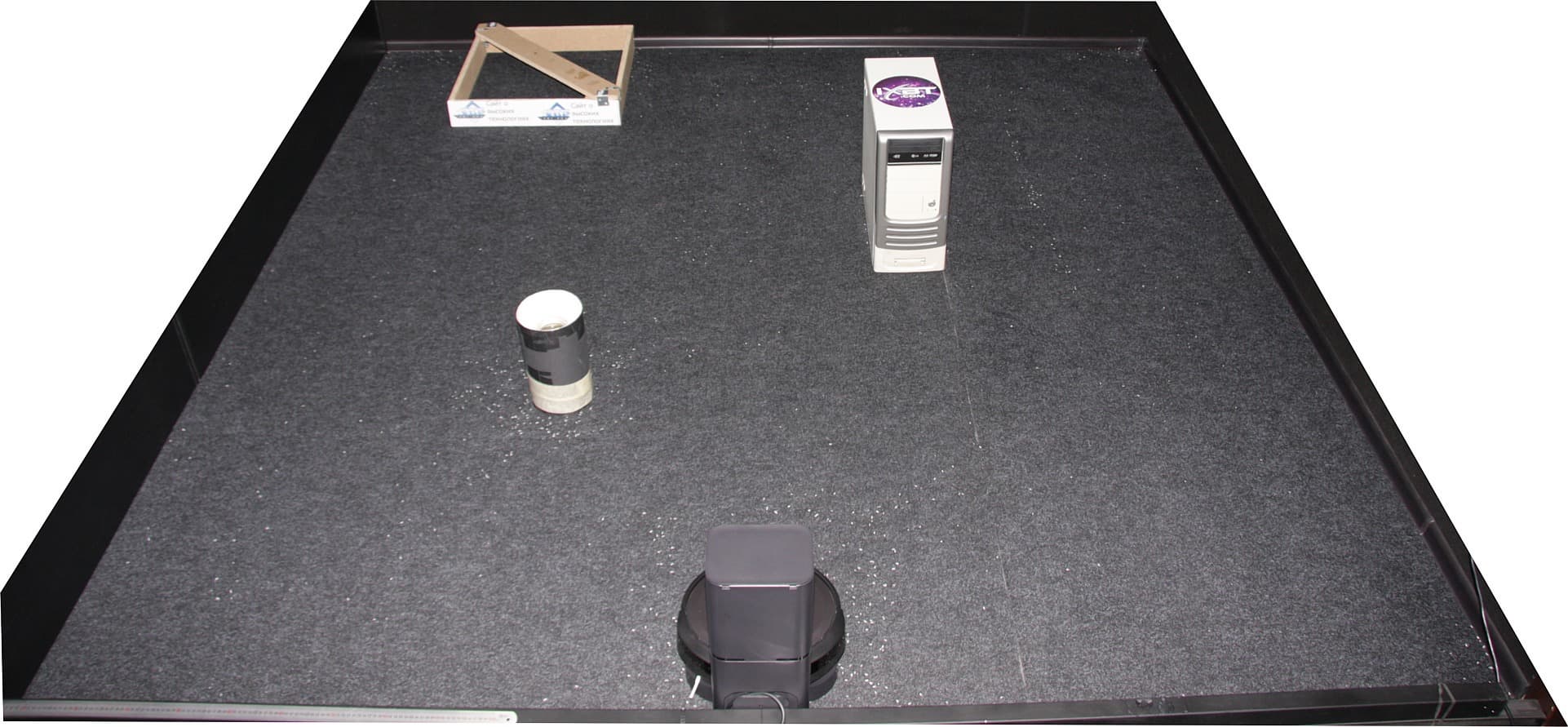 Дополнительно было испытано устройство ограничения в режиме виртуальной стены. Стена свою задачу выполнила и создала непреодолимый для робота барьер длиной как минимум в 3 м. В режиме кругового ограничителя стена работала так, как и было заявлено: примерно в радиусе 50 см от ограничителя мусор на полу остался.