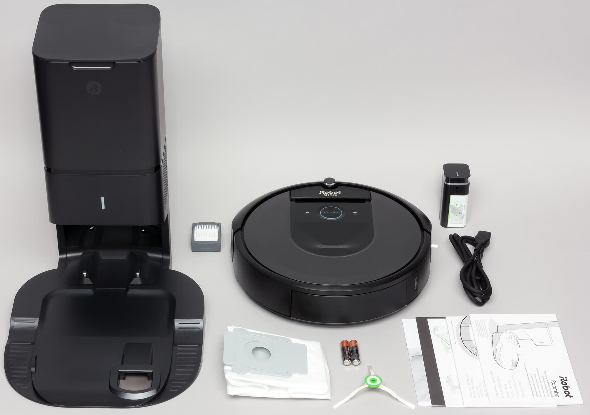 В комплект поставки входят все необходимые для работы аксессуары. Запасные части и расходные материалы в комплекте представлены элементами питания для виртуальной стены, сменным складчатым фильтром (еще один установлен в пылесборнике), двумя мешками для сбора мусора и одной боковой щеточкой (в дополнение к той, что уже установлена на роботе).