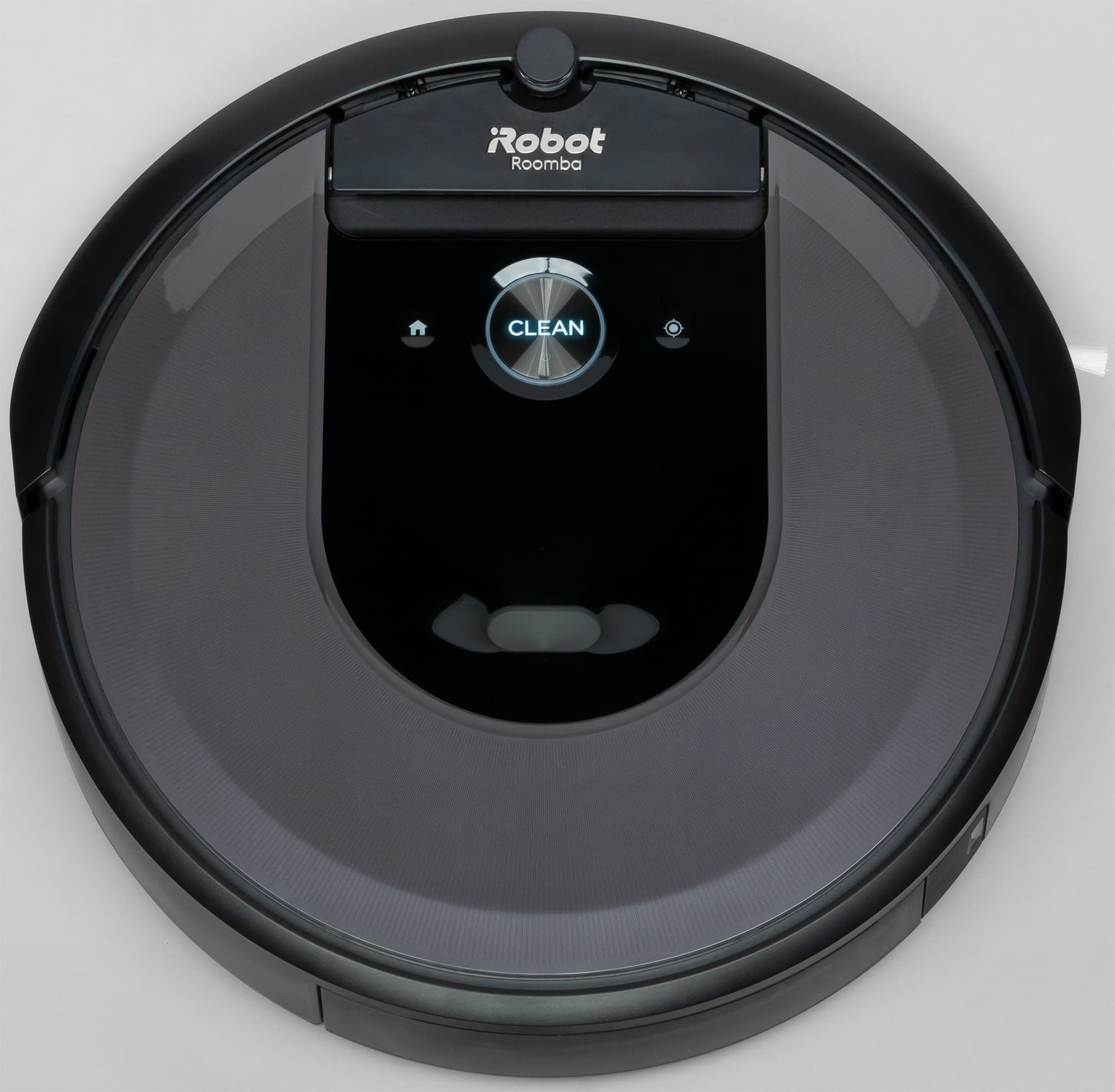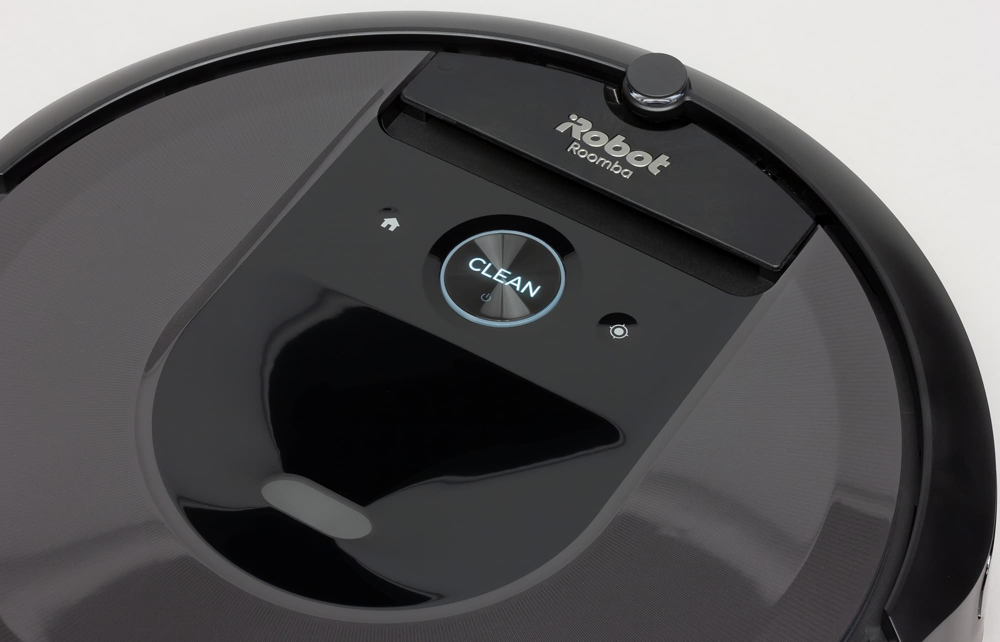 Ближе к передней части на верхней панели находятся три сенсорные кнопки — большая круглая кнопка с ободком из полупрозрачного пластика и по бокам от нее две небольших в виде углублений с серебристыми значками. Ободок большой кнопки имеет многоцветную многозонную подсветку. Цвет и характер его свечения, а также белая подсветка надписи Clean указывают на то, что происходит с роботом в данный момент. Ближе к переднему краю есть откидывающаяся вверх на небольшой угол ручка, за которую пылесос удобно переносить.