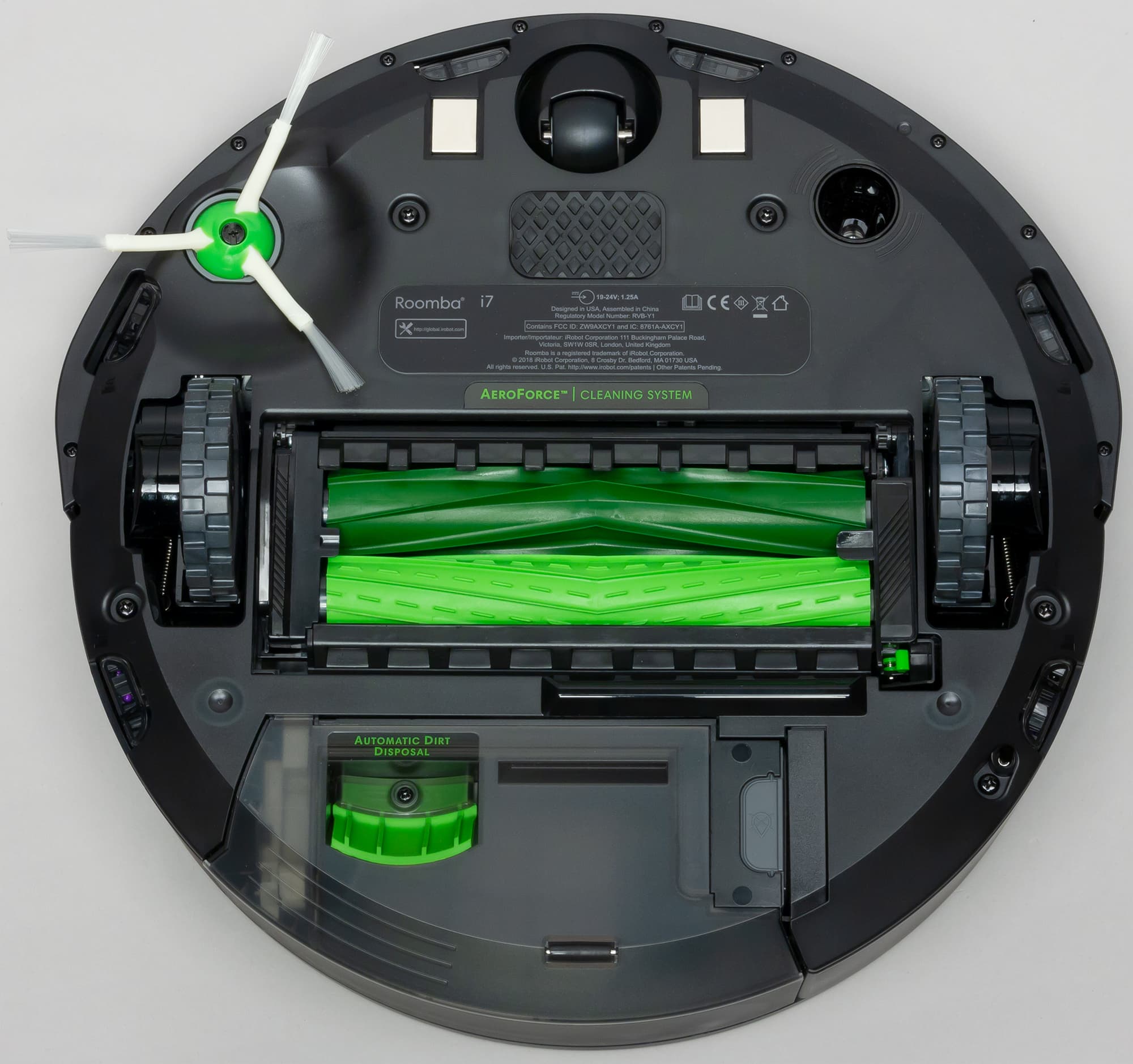 Перевернув пылесос вверх днищем, в передней части (сверху на фотографии) мы видим две контактные площадки, ролик на вращающейся платформе, боковую щетку, гнездо нижней камеры, далее вниз — два ведущих колеса на подпружиненных рычагах, отсек с основными валиками-щетками и дно отсоединяемого пылесборника. По периметру днища робота ближе к краю расположены шесть ИК-датчиков перепада высоты.