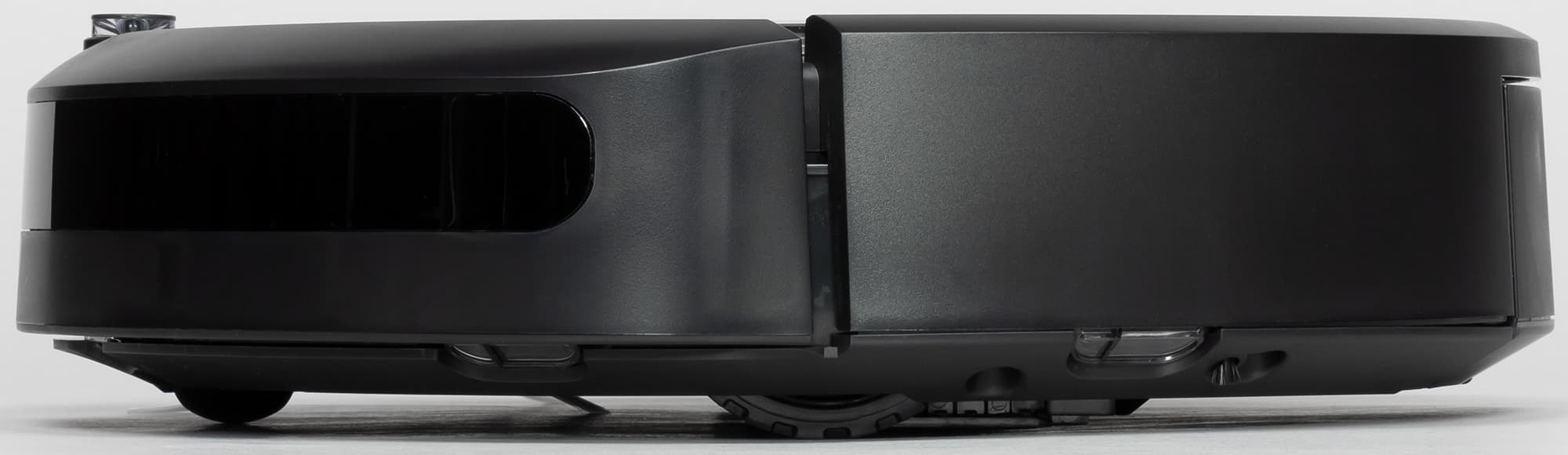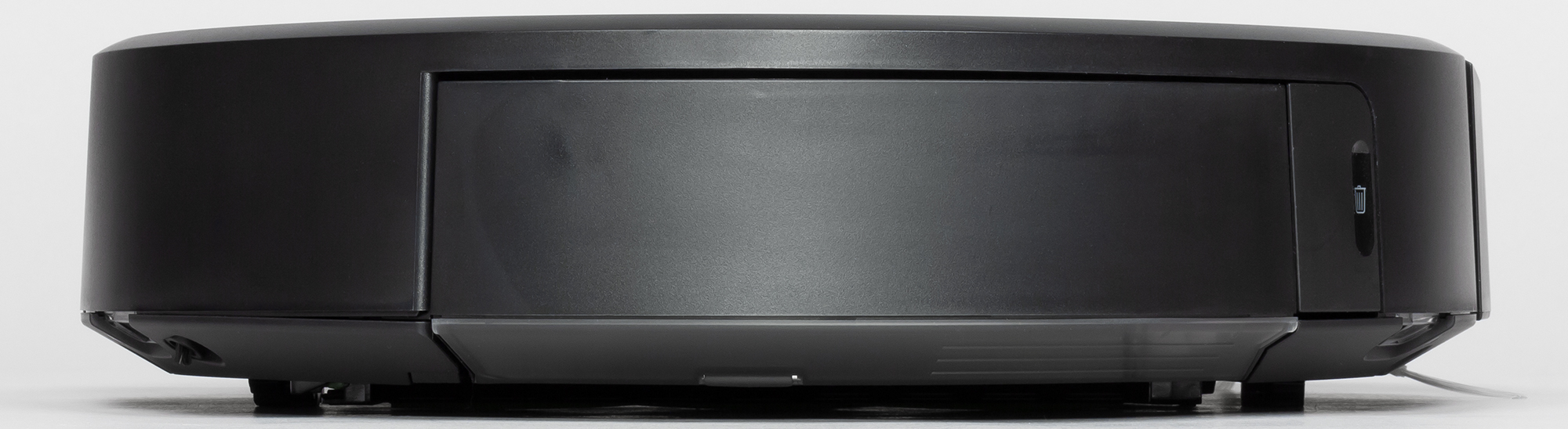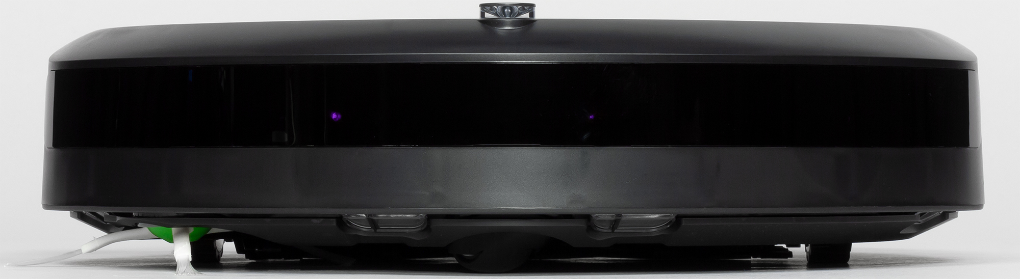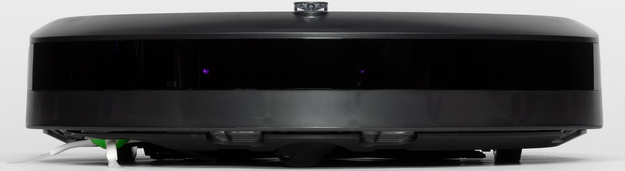 Верхняя часть бампера прикрыта вставкой из плотно тонированного пластика черного с виду, но прозрачного для ИК-излучения (за ним спрятаны ИК-датчики препятствий). Вверху по центру бампера — обзорный выступающий вверх ИК-датчик, который собственно и определяет минимальную высоту (мы получили 92 мм) просвета предметов обстановки, под которые пылесос еще может забраться. Этот датчик помогает роботу парковаться на базу и избегать виртуальной стены. Никакой защиты мебели от столкновений с роботом на бампере нет.