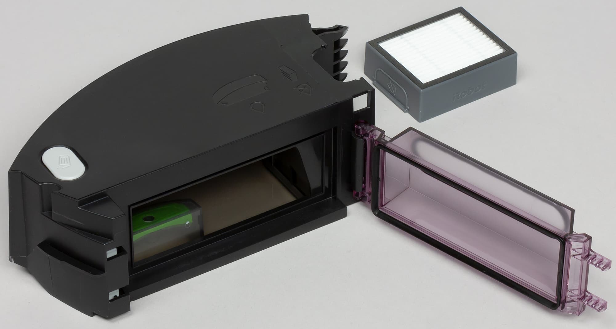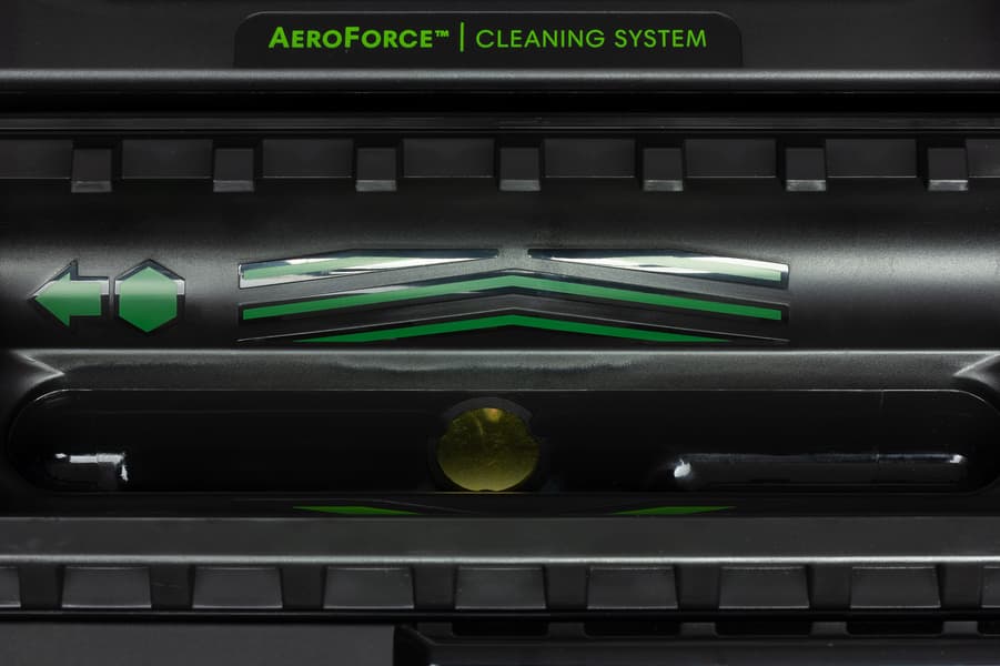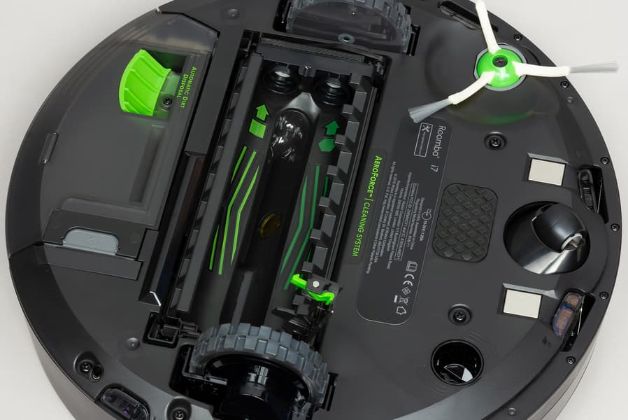 Вращающиеся щетки сначала подхватывают мусор с пола, затем мусор воздушным потоком перемещается в емкость пылесборника. Тяжелый мусор остается на дне емкости, а мелкий и легкий задерживается воздушным фильтром. Отметим, что такая конструкция не исключает прямой заброс тяжелых частиц в пылесборник, но делает его маловероятным. Стыки узлов и деталей на всем пути воздуха от щеток до вентилятора имеют упругие уплотнения, а щеточный узел соединен с корпусом упругим и герметичным воздушным рукавом, что уменьшает паразитный подсос воздуха. Вентилятор, установленный в корпусе робота, высасывает воздух из пылесборника и гонит его по воздуховоду в нишу отсека основных щеток, в итоге основной поток воздуха выходит через щель перед щетками и сдувает мусор с пола прямо к вращающимся щеткам. Это увеличивает эффективность сбора легкого мусора, в сравнении с предыдущими моделями Roomba, у которых воздух просто выдувался назад.