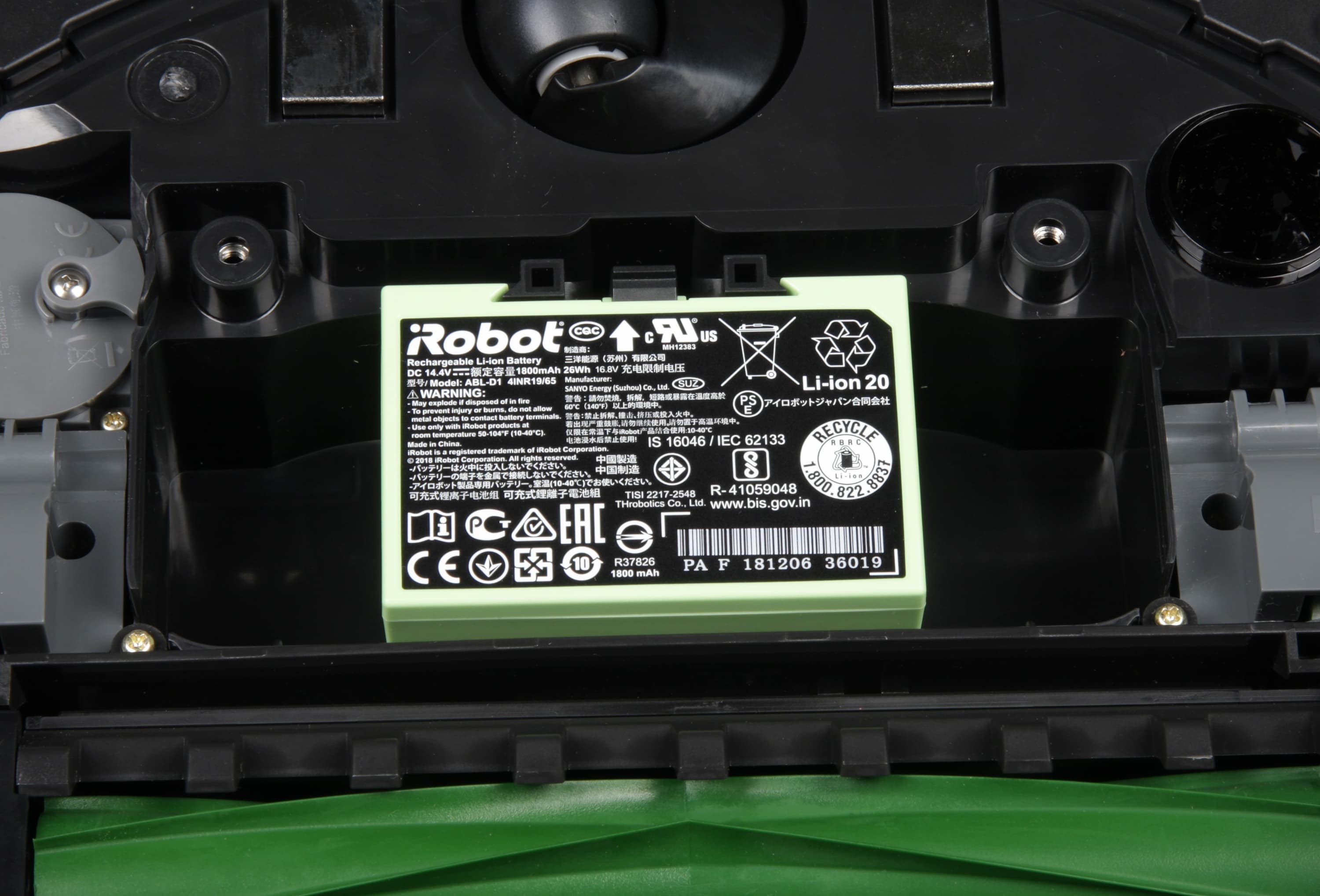 Чтобы добраться до аккумуляторной батареи, нужно снять боковую щеточку, открутить несколько винтов на днище и снять его. В роботе установлена литиевая батарея емкостью всего 26 Вт·ч (14,4 В, 1800 мА·ч). Конструкция батареи новая, совместимости с предыдущими поколениями Roomba нет, что случилось впервые за много лет.