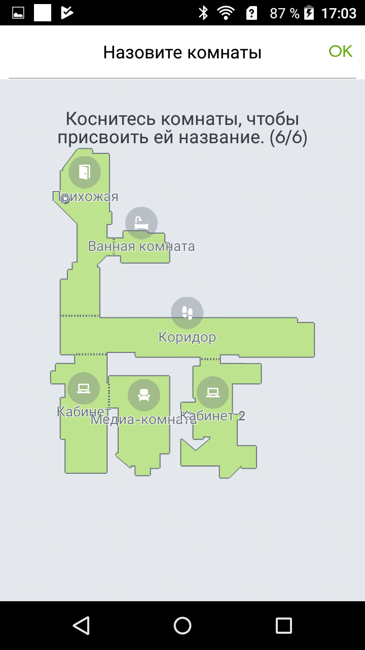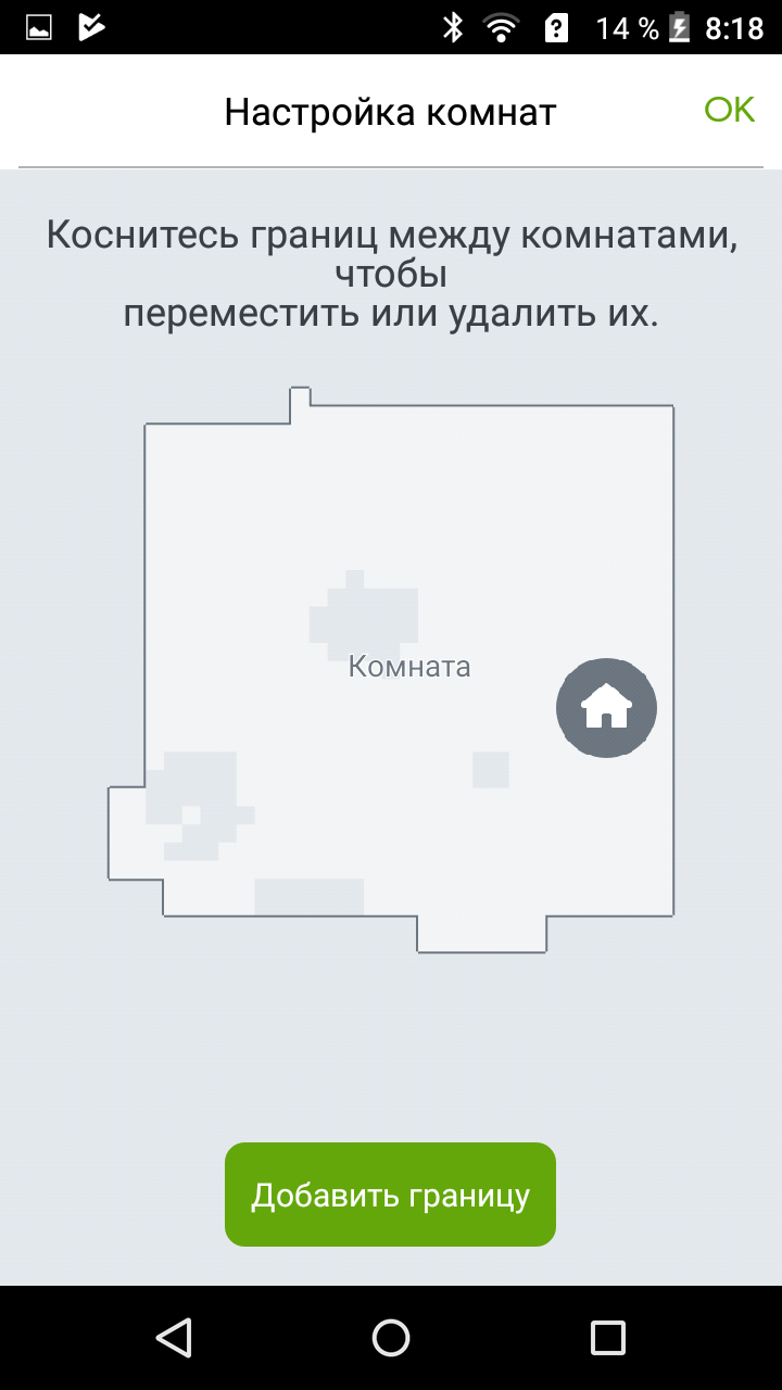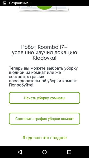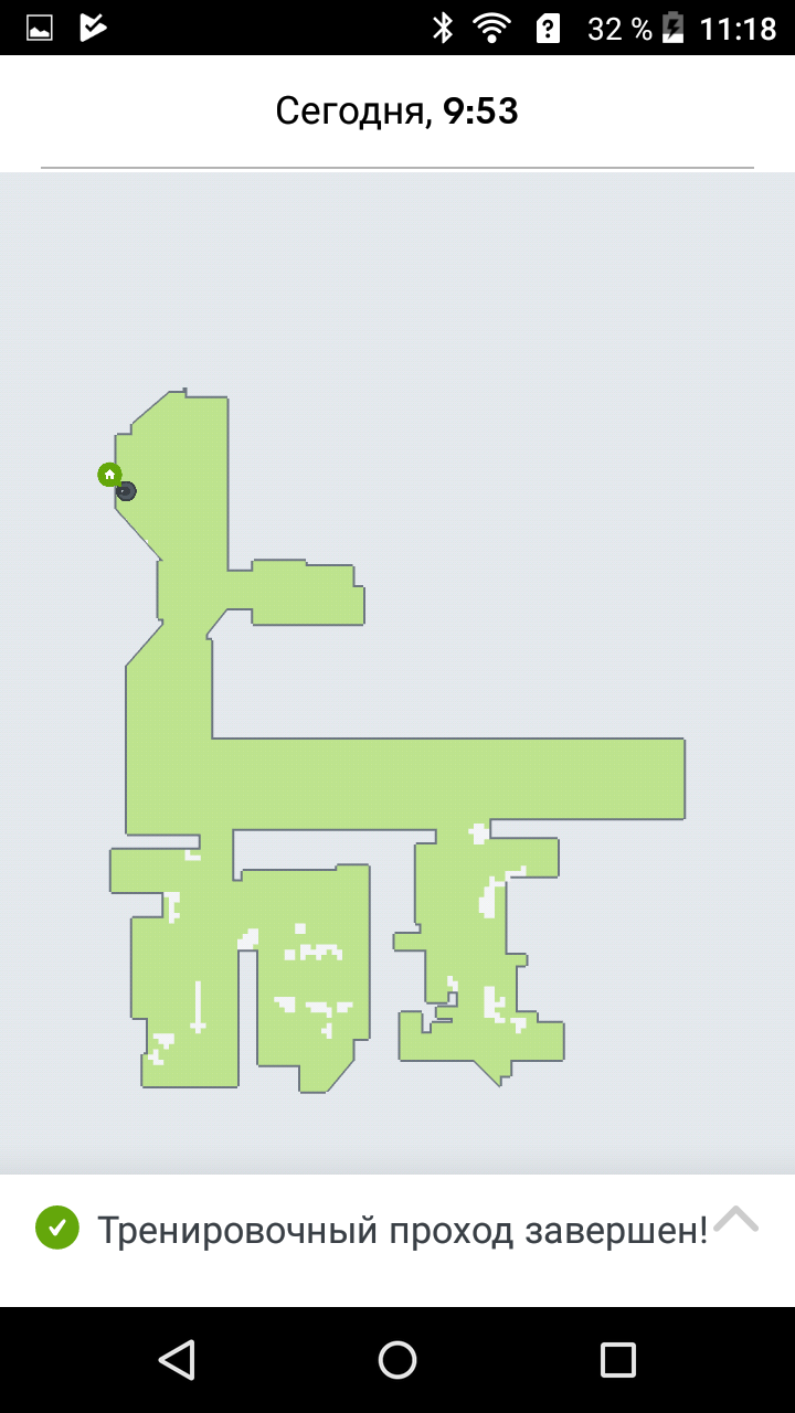 Непосредственно во время уборки пользователь не может видеть в мобильном приложении создаваемую роботом карту и где именно находится в данный момент робот. Это не очень удобно. Кроме того, после первой уборки в новом помещении робот даже не рисует карту, а сообщает, что обучение не закончено. Только после второго прохода карта готова, и пользователь может с ней работать (построена карта тестового помещения, показанного на фотографиях выше):