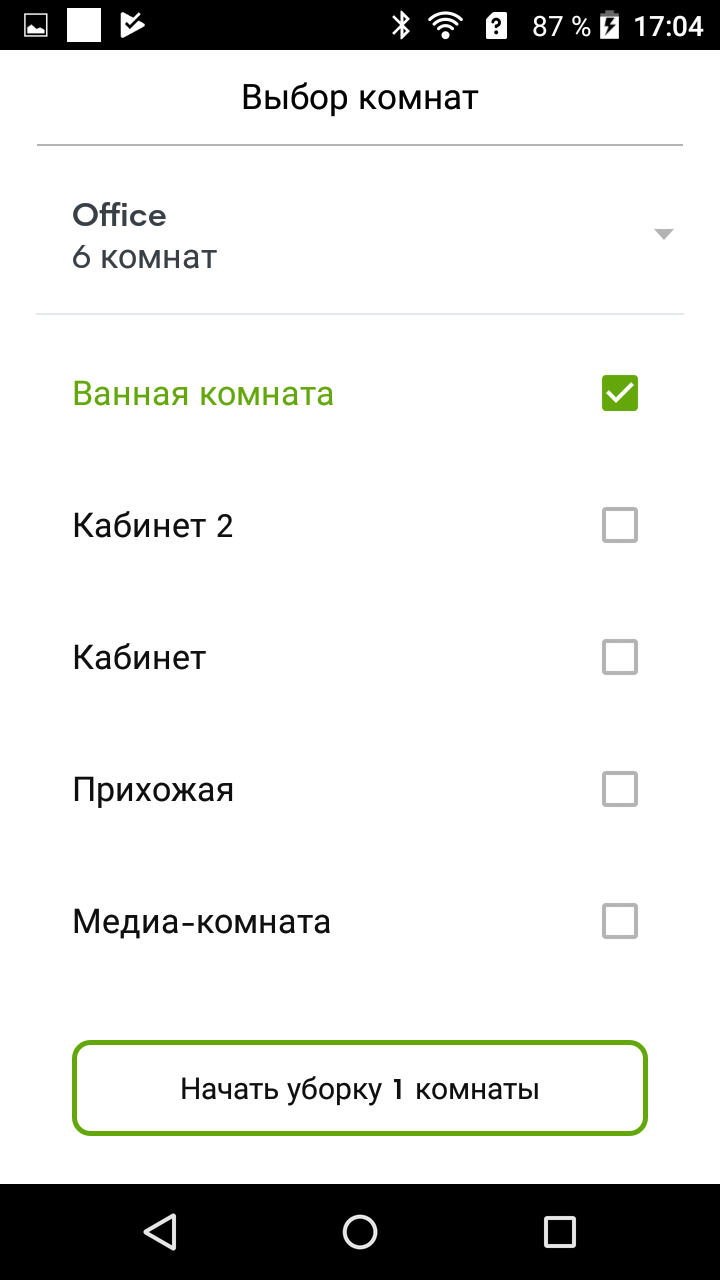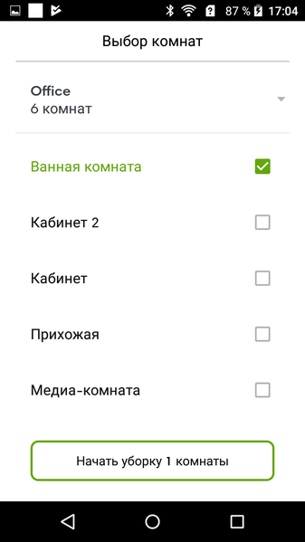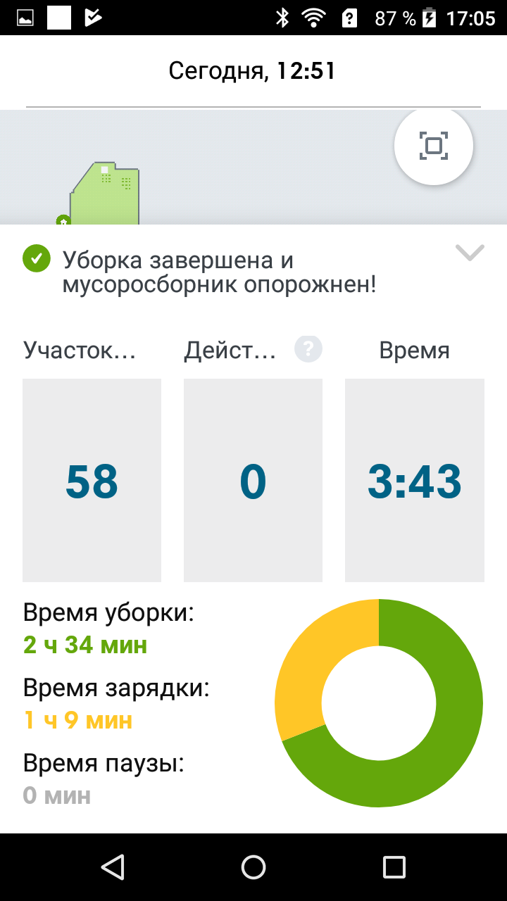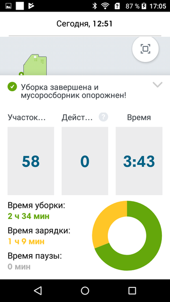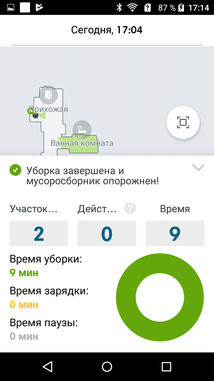 Теперь робота можно послать убрать, например, в ванной комнате, что он и сделает, в данном случае за 9 минут: