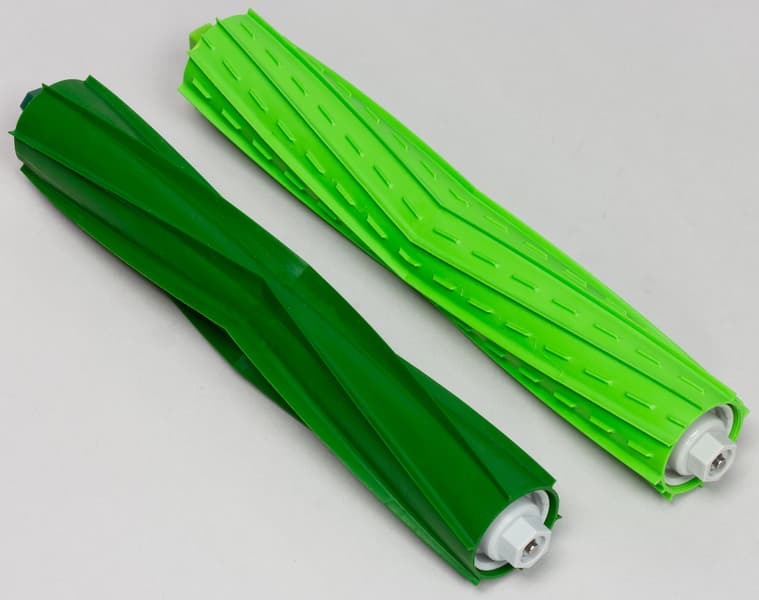 Эти щетки немного отличаются, от валиков в Roomba 800-й и 900-й серии, однако их можно взаимно переставлять, поменяв втулки с подшипниками. Напомним, что основным преимуществом таких валиков без щетины является то, что они очень мало наматывают на себя волосы, шерсть, нитки и т. д., а все немногое намотавшееся (в основном на торцы) легко снимается при очистке без использования каких-либо инструментов. Владельцы домашних животных с шерстью должны особенно оценить это. Отсек, в котором находятся основные щетки, закреплен на рычажках, поэтому с ходом примерно в 8 мм он следует рельефу пола, что увеличивает эффективность очистки. Проволочных направляющих-ограничителей нет, предотвращение наматывания уголков ковриков возложено на систему управления и контроля вращения щеток.