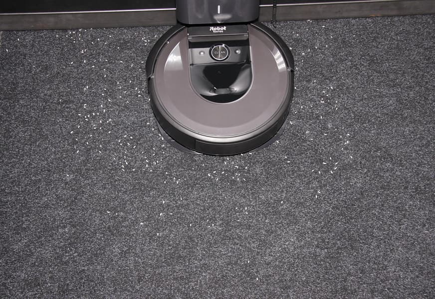 В целом качество уборки принципиально не отличается от того, что мы получили при тестировании iRobot Roomba 980 и 960. После автоматического опустошения пылесборника робота в нем может остаться порядка 20% риса. В одном из тестов случилась ожидаемая ситуация: зернышко риса застряло между шторкой из упругого пластика и краем отверстия в пылесборнике: